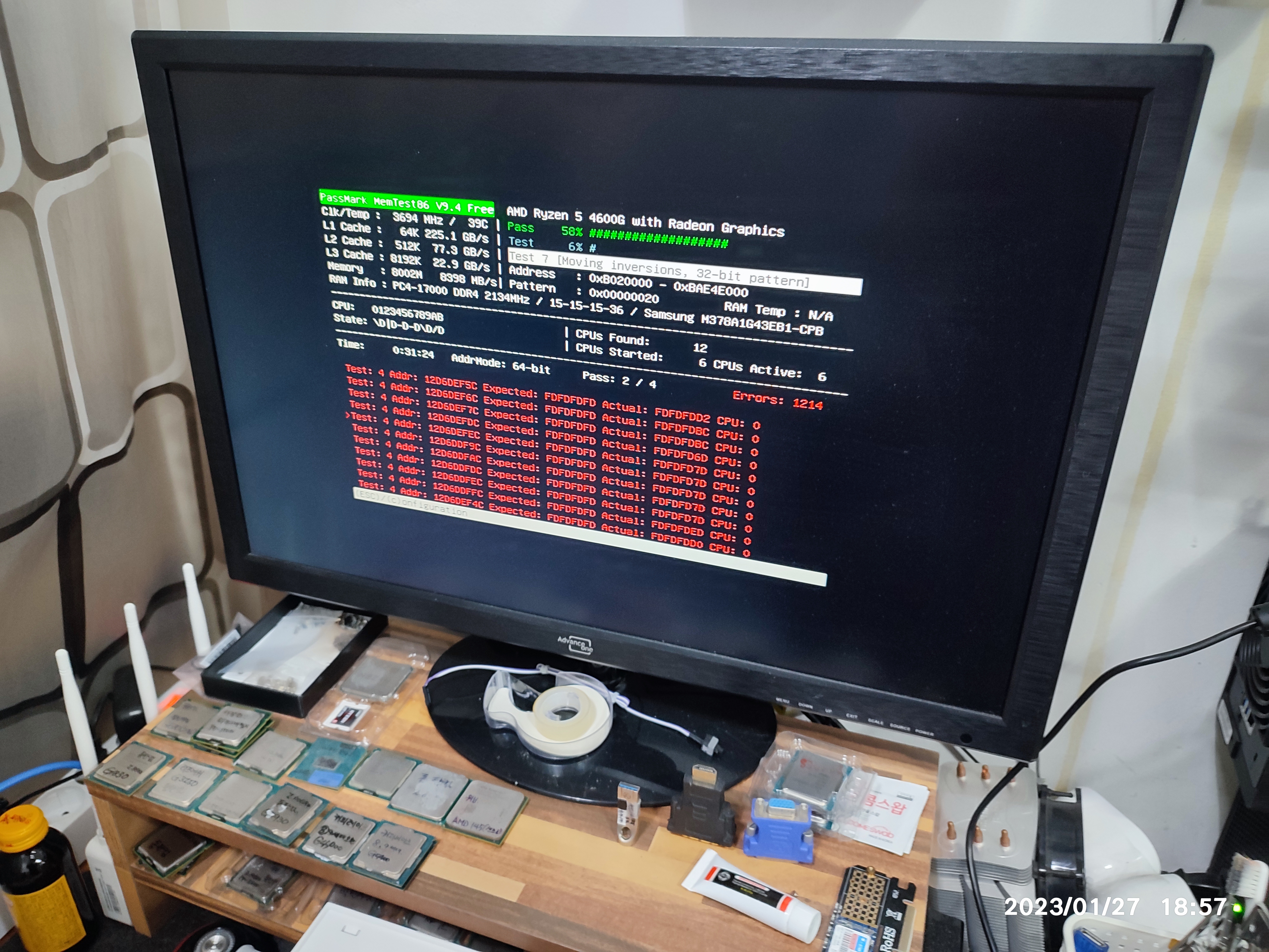 메모리 4개 중에 하나는 에러가 검출됐습니다. 이 메모리를 조금 더 집중적으로 검사를 해봤습니다. 위의 점검한 메인보드는 또 다른 테스트용 메인보드이고요. 손님의 메인보드에 장착해서 이상 여부를 다시 확인해봤습니다.