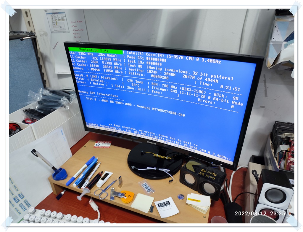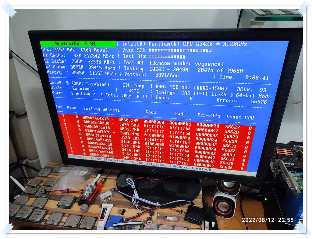Additional memory checks were performed. If it passes normally, there will be one PASS as shown below. If there are errors in the memory, the number of errors increases. (As shown in the picture on the right, 53% is in progress, and it says that 56576 errors have been detected. 0 known-good memory appears.)