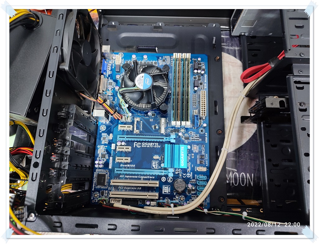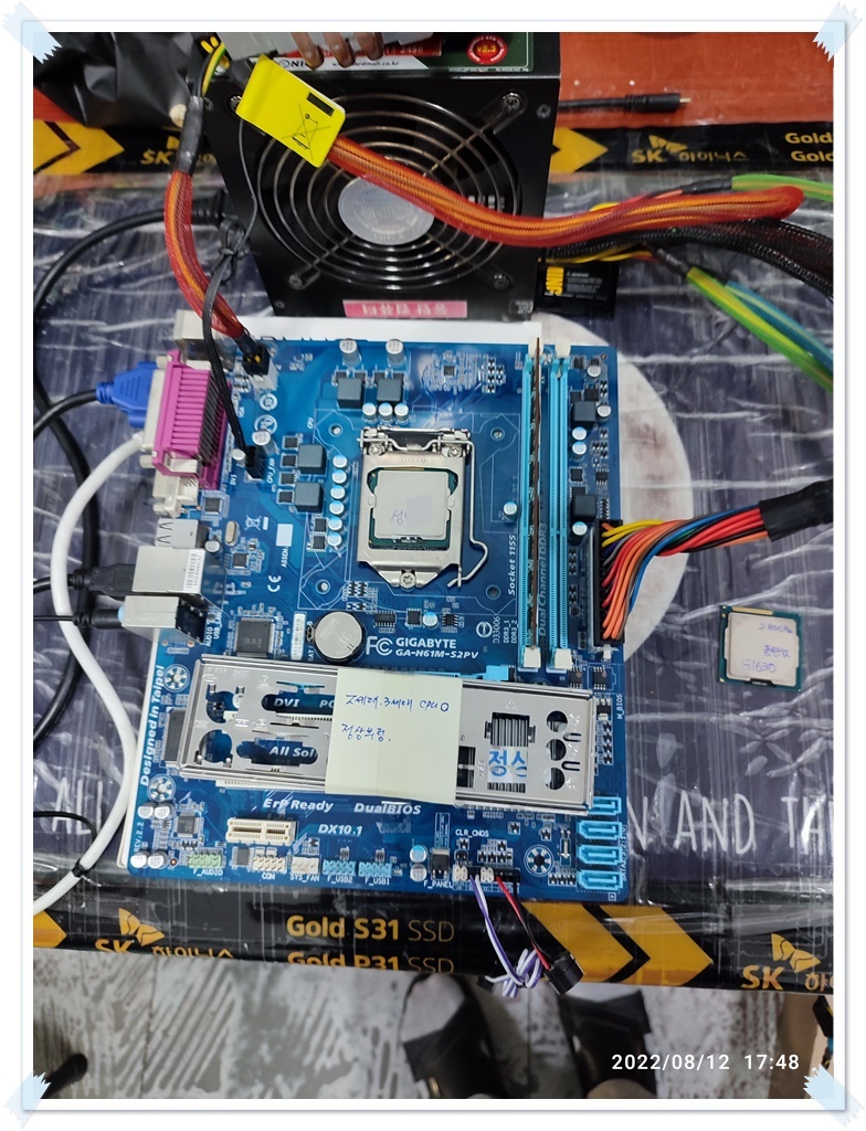 Below is the main board for my test. This is a test motherboard that has been tested with my CPU, memory, and power supply to see if it works well and classified. This is a compatible motherboard with your CPU, memory, and graphics card. First, I reconnect my parts, and check the status of my motherboard again before installing the customer's parts. Some boards suddenly stop working after years, even though they were only testing and storing, so before testing the customer's accessory, check the condition first and conduct a cross-test. I couldn't leave the test process in the picture just because I checked with you. My board normally enters the bios screen. (It didn't go over to the window screen. It's more accurate to check like that, but it takes a long time.)