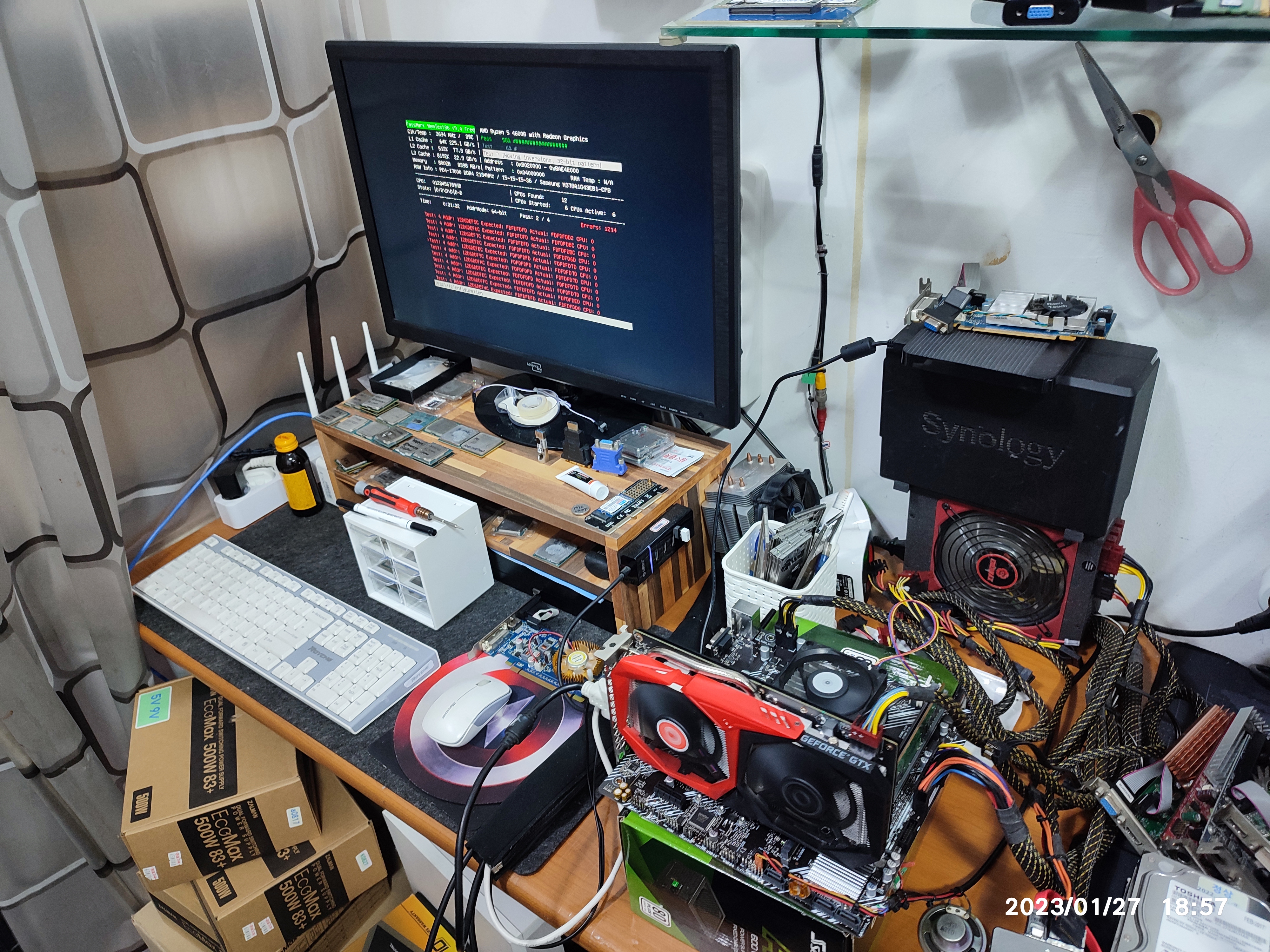 아래는 제 테스트용 메인보드입니다. 제 CPU와 메모리, 파워서플라이 등으로 테스트해서 잘 되는 걸 확인하고 분류해둔 테스트용 메인보드입니다. 손님의 CPU와 메모리, 그래픽카드 등의 호환성이 있는 메인보드입니다. 일단은 제 부품을 다시 연결해서, 메인보드가 정상적으로 동작하는지, 손님 부품을 장착하기 전에 제 메인보드의 상태를 다시 확인합니다. 테스트하고 보관하고 있었을 뿐인데도, 세월이 지나면, 갑작스럽게 동작을 멈추는 (고장나는) 보드도 있기 때문에, 손님 부속을 테스트하기전에 먼저 상태 점검해보고 교차 테스트 진행합니다. 손님과 같이 확인한다고 테스트 과정은 사진상으로 남기진 못했네요. 제 보드는 정상적으로 바이오스 화면까지 진입됩니다. (윈도우 화면까지는 넘어가지 않았습니다. 그렇게 확인하는 게 더 정확하지만, 시간이 오래 걸립니다.)