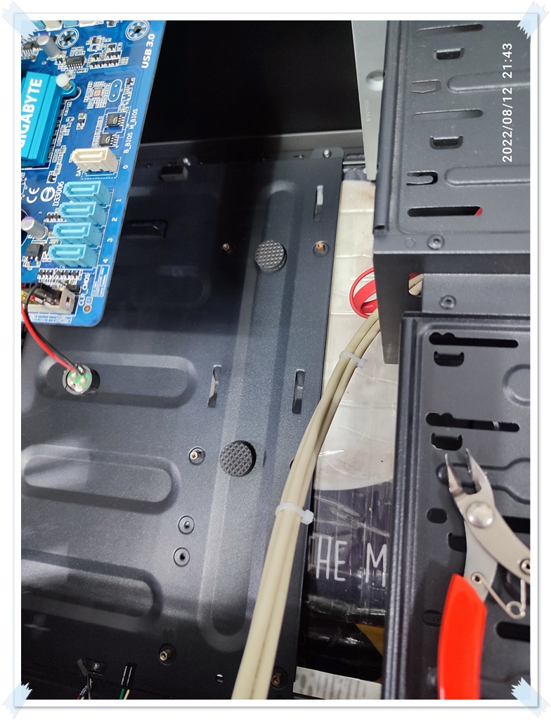 메인보드는 넓은 편인데, 케이스는 구형 케이스라서, 서포트 볼트를 고정할 구멍이 없어서 아래와 같이 스펀지를 대서, 메인보드와 케이스의 철판이 닿지 않도록 조치를 취했습니다. 필수적인 건 아니지만, 해두면 좋습니다. 간혹, 파워서플라이 전원 공급된 상태로 24핀 케이블을 꽂을 때, 기판이 처지면서, 케이스 철판과 합선 후 고장나는 사례가 있을 수 있습니다. 스파크만 튈 수도 있고요.