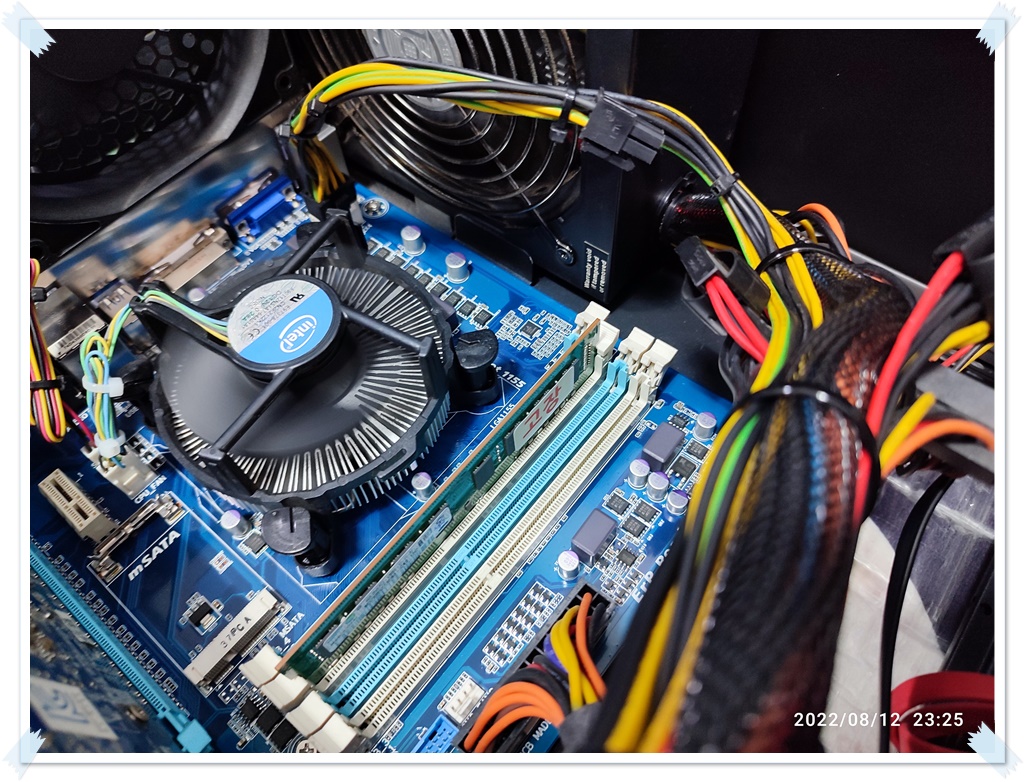 손님께서 가져오신 중고 메인보드를 준비해서, 제 부속(CPU, RAM)을 장착해서 메인보드 동작 테스트를 진행합니다. 손님 CPU는 3세대 i5 제품이지만 그래도 i5 제품이라서 고장나면 비용이 많이 드니깐, 3세대 셀로론 CPU를 장착해서 테스트했습니다. 간혹, 메인보드 불량으로 CPU가 사망하는 경우도 있습니다. 드물지만 1년에 1~2건 정도는 들어올 정도로 없지 않은 경우이기에 조심하면 좋습니다. (메인보드 불량으로 CPU 고장내는 사례입니다.)