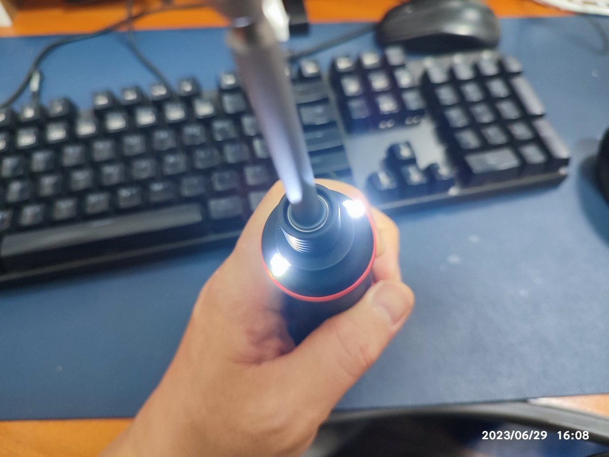 전동드라이버 앞쪽에 LED 전구가 달려있습니다. 불빛은 카메라에 찍힌 사진처럼 그렇게 밝지는 않습니다. 없는 것보단 낫겠지만 어두운 곳에서는 보일 수 있겠는데, 밝은 곳에서는 어차피 필요 없죠? 밝으니깐