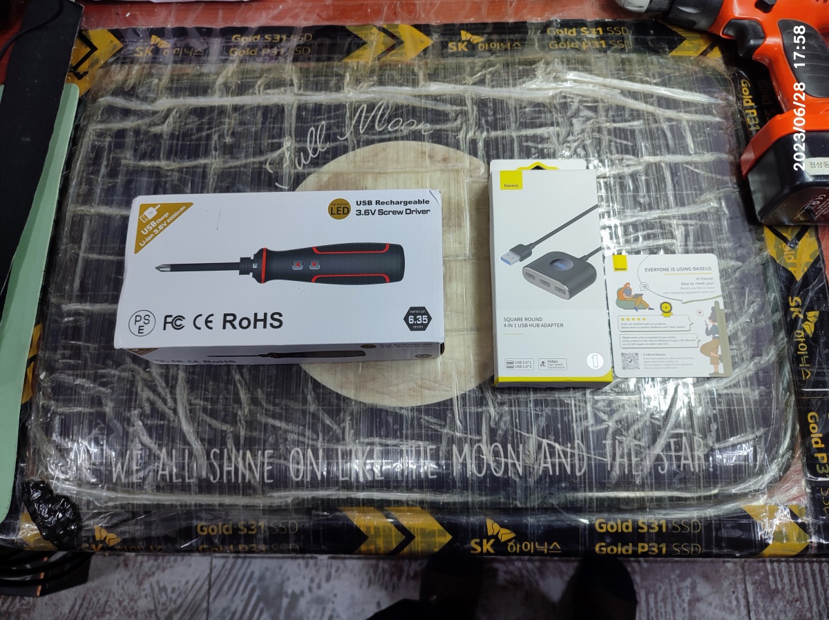 조금 더 세밀한 작업은 수동 (손) 드라이버로 작업(빨간색 드라이버)합니다. 파워서플라이처럼, 조금 세게 돌려도 상관없는 부속 조립할 때, 전동 사용하고 주로 푸는 용도로 사용합니다. 아래는 알리익스프레스에서 구입한 전동 드라이버입니다. 제품명은 USB Recahrgeable 3.6V Screw Driver이라고 적혀있네요. G2-7L Drills라고 판매되고는 있습니다. $24(3만원대)정도에 구입했습니다.
