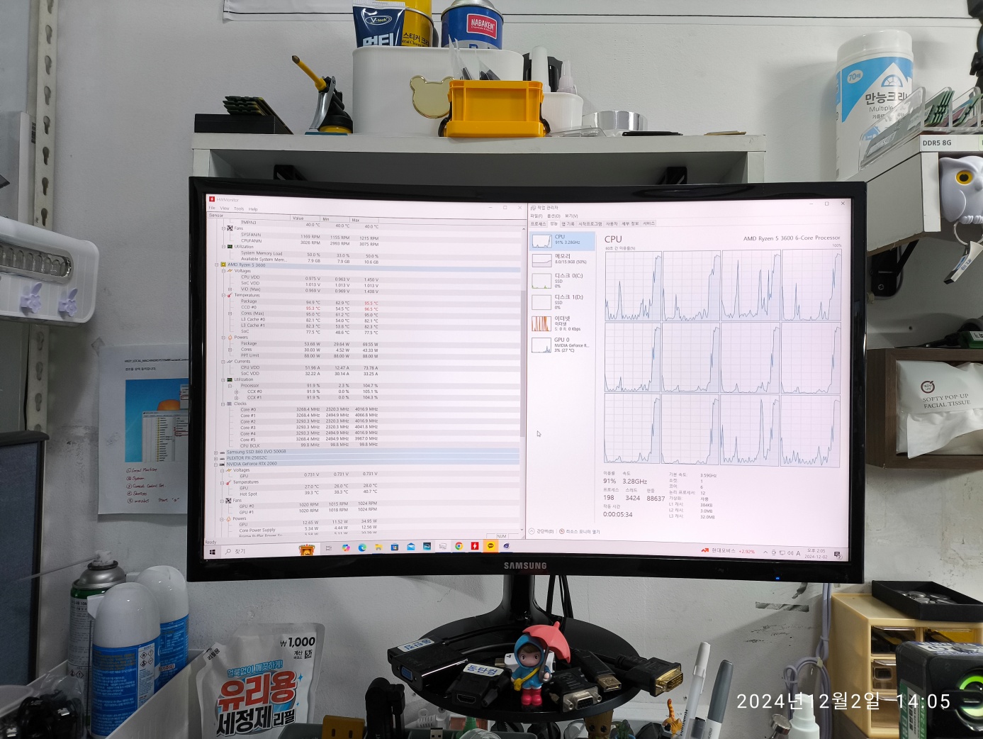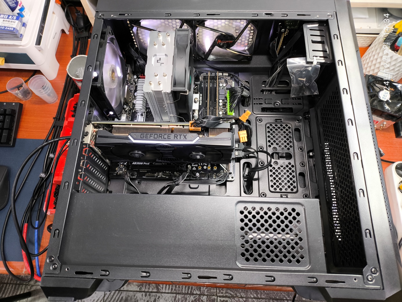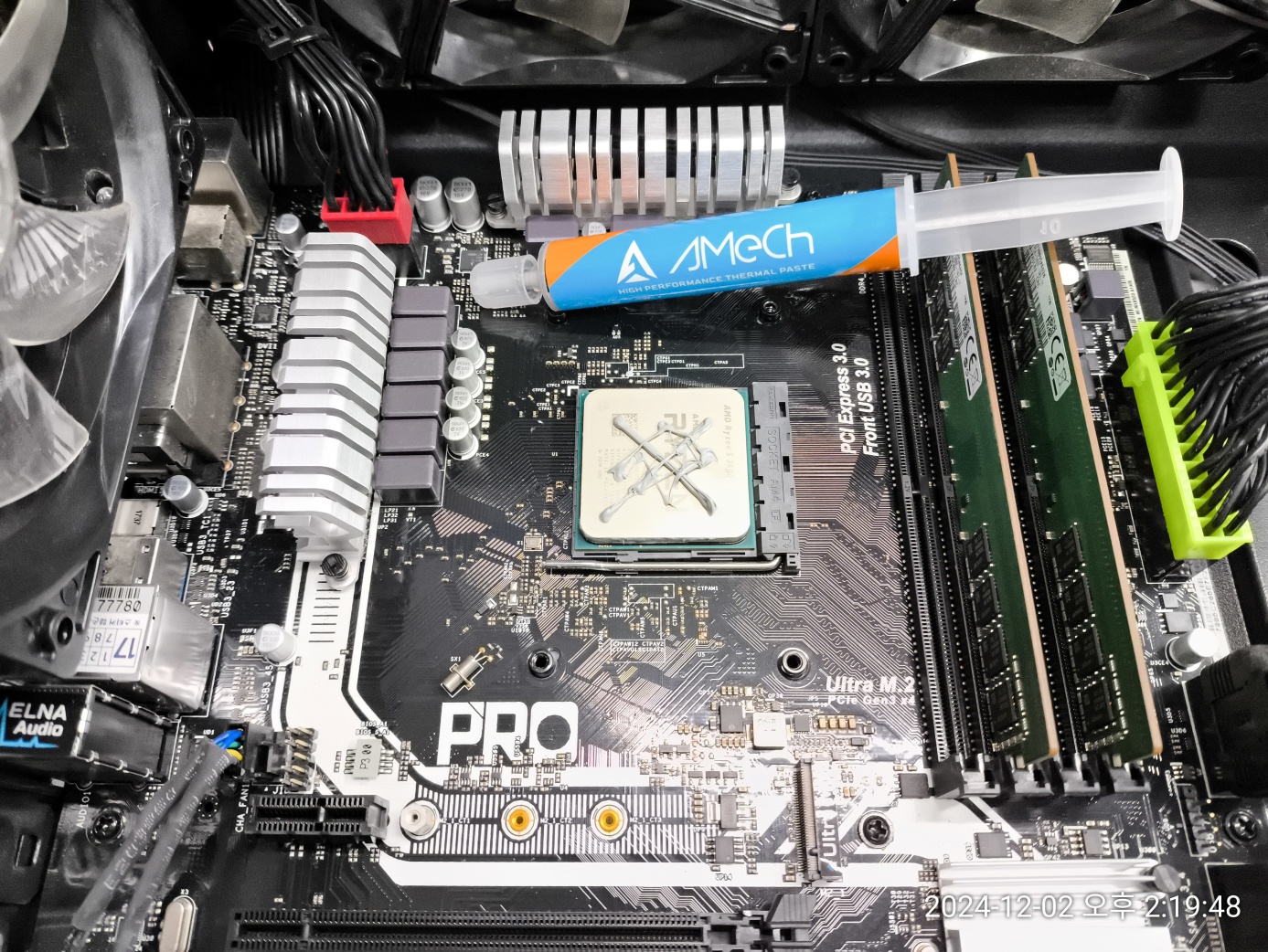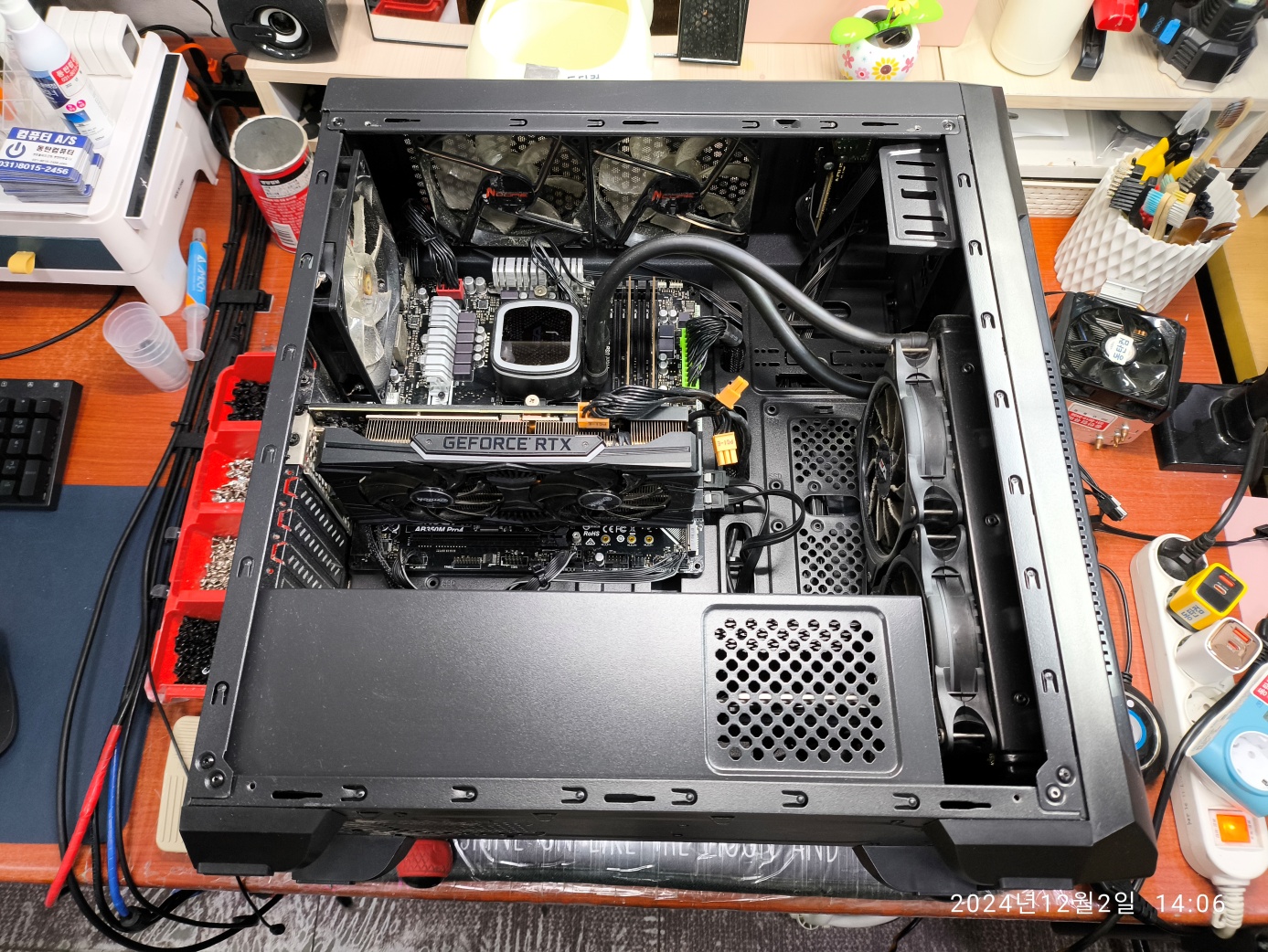 CPU는 고사양 CPU가 아니기 때문에 공랭 쿨러로 충분히 식혀서 사용할 수 있는 라이젠5 3600제품입니다. 그것도 1팬 짜리 타워형 쿨러를 달아주면 충분히 CPU 온도가 커버됩니다. 수랭 쿨러가 훨씬 냉각 성능은 좋습니다만 워터 펌프 모터의 내구성 문제가 있어서 저는 개인적으로 수랭은 거의 사용하지 않습니다. 수리점 특성상 생산된지 오래된 컴퓨터가 입고되는 편이고 고장 난 수랭 쿨러를 공랭 쿨러로 교체해서 달아드리는 일이 많습니다.