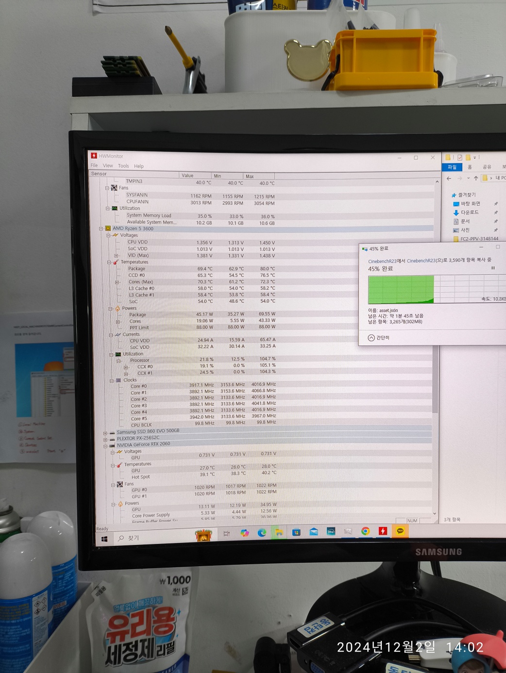 그래서, 컴퓨터를 접수할 때, 왜 청소를 생각하셨는지 물어봅니다. 컴퓨터는 정상인지도 같이 물어보고요. 사용 중 아무 문제는 없다고 말씀하셔서, 점검차 컴퓨터를 켜봤는데요. 가벼운 압축 해제 작업으로 CPU 온도가 80도 이상 찍히고 있습니다. 벤치마크 프로그램을 돌리면 시작하면 100도가 찍히는 부분은 청소만으로 해결될 부분은 아니기 때문에 컴퓨터 점검해서 원인을 찾아서 해결해야 합니다. 먼지 청소는 그다음 문제입니다.
