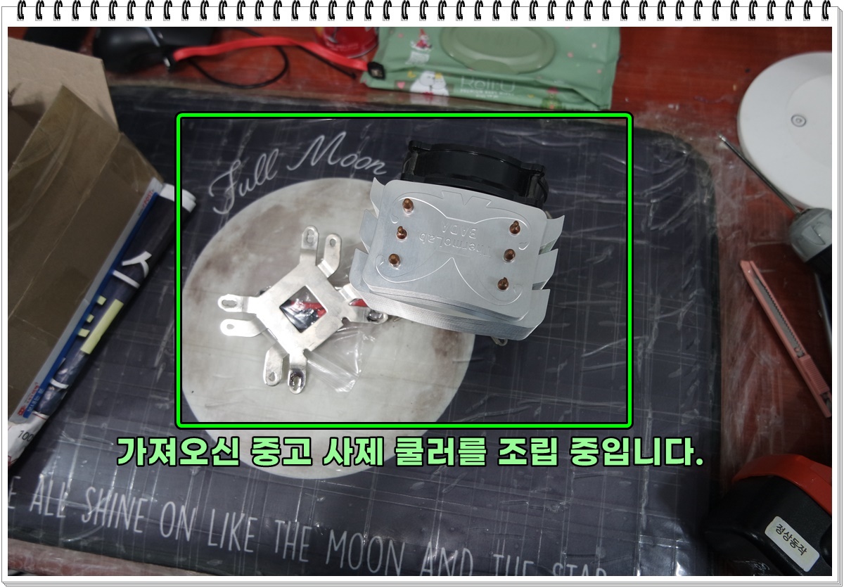 같이 가져오신 중고 사제쿨러를 조립하려고 준비중이네요. (서모랩의 바다2010쿨러 같습니다.) 쿨러 고정 기판이 예전 (금속)방식이네요. 요즘 나오는 제품(트리니티)은 플라스틱으로 제조해서 나오는 듯 합니다.