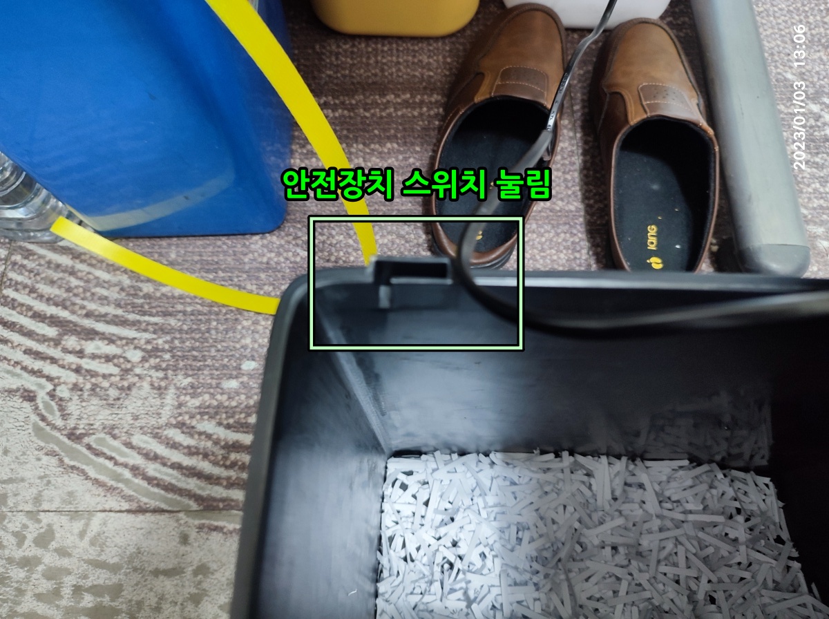 가득찬 통을 안 비우고 계속 세절했더니 아래와 같이 종이가 세절기 밑에 뭉치네요.