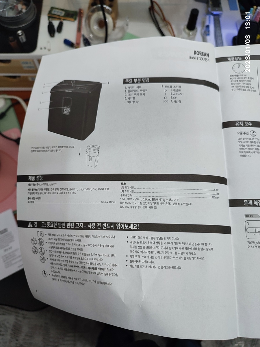 이 제품은 연속 3분 동작하면 모터 발열을 식혀줄 시간 40분간은 휴식이 필요하다고 하니깐 대용량의 문서를 파쇄하는 용도로는 적합하지 않을 거 같아요. 권장 사용량은 하루에 30장이라고 합니다. 실제로는 그것보다는 더 많이 사용할 수 있겠지만, 제조사에서 권장하는 사양은 낮은 보급형-가정요-소형 사무실용 제품입니다.