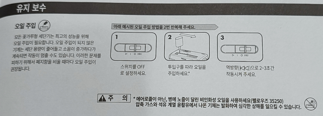 제품을 구입할 때, 옵션으로 오일을 구입해서 궁금했었는데, 아래와 같이 오일 한 통을 같이 넣어주셨네요. 세절한 용지가 보관통에 가득차면, 오일을 기어에 넣어서 역회전을 시켜주라고 하네요. 오일이 부족하면, 동작 소음이 커질 수 있다고 합니다.