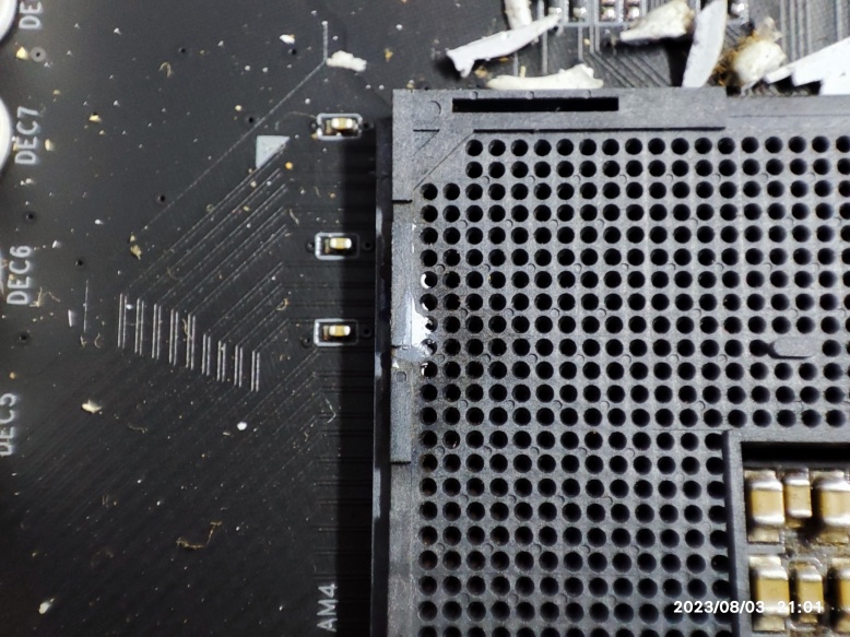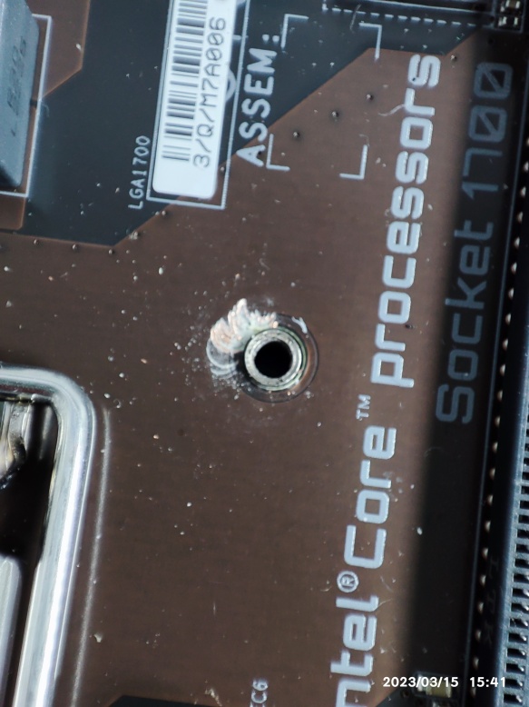 아래와 같이 CPU 공랭 쿨러를 조립할 때, 기판(메인보드)에 나사를 박아서 메인보드의 문제(고장)가 생겼습니다. 이 부분은 컴퓨터 수리점에서는 고치긴 힘든 고장입니다. 빠르게 처리하고 싶은 경우에는 신품 메인보드 교체가 가능하고요. 시간적인 여유가 있으시면, A/S 센터에서 가능하다면 유상 수리로 리퍼 제품을 받아보셔야 할 거 같습니다. (서비스센터에 전화하셔서 A/S 가능한지 물어보실 거 같습니다.)