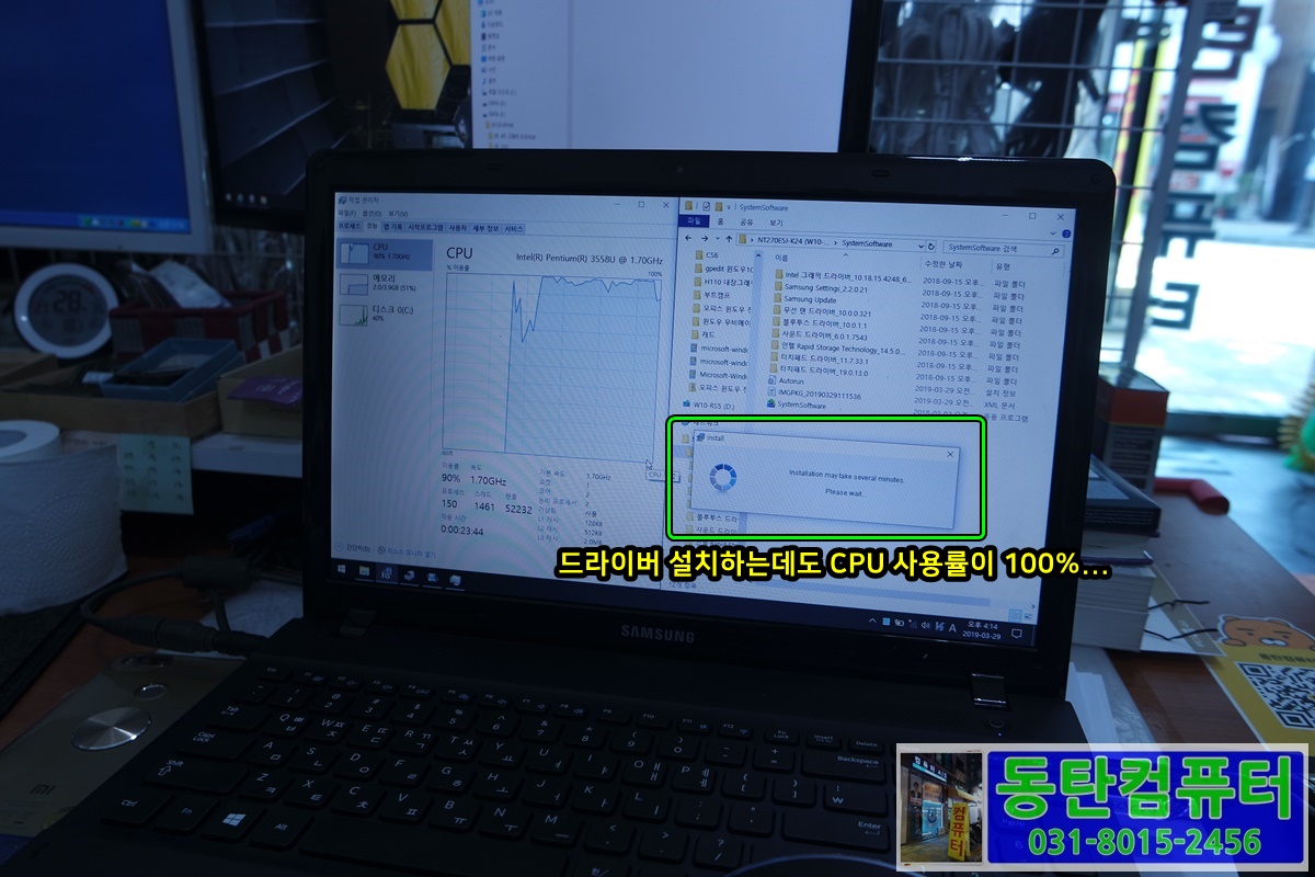 기대치에 못 미치는 성능을 보여줬습니다. 드라이버 설치 과정에서 거진 100% 사용률을 보여주네요.