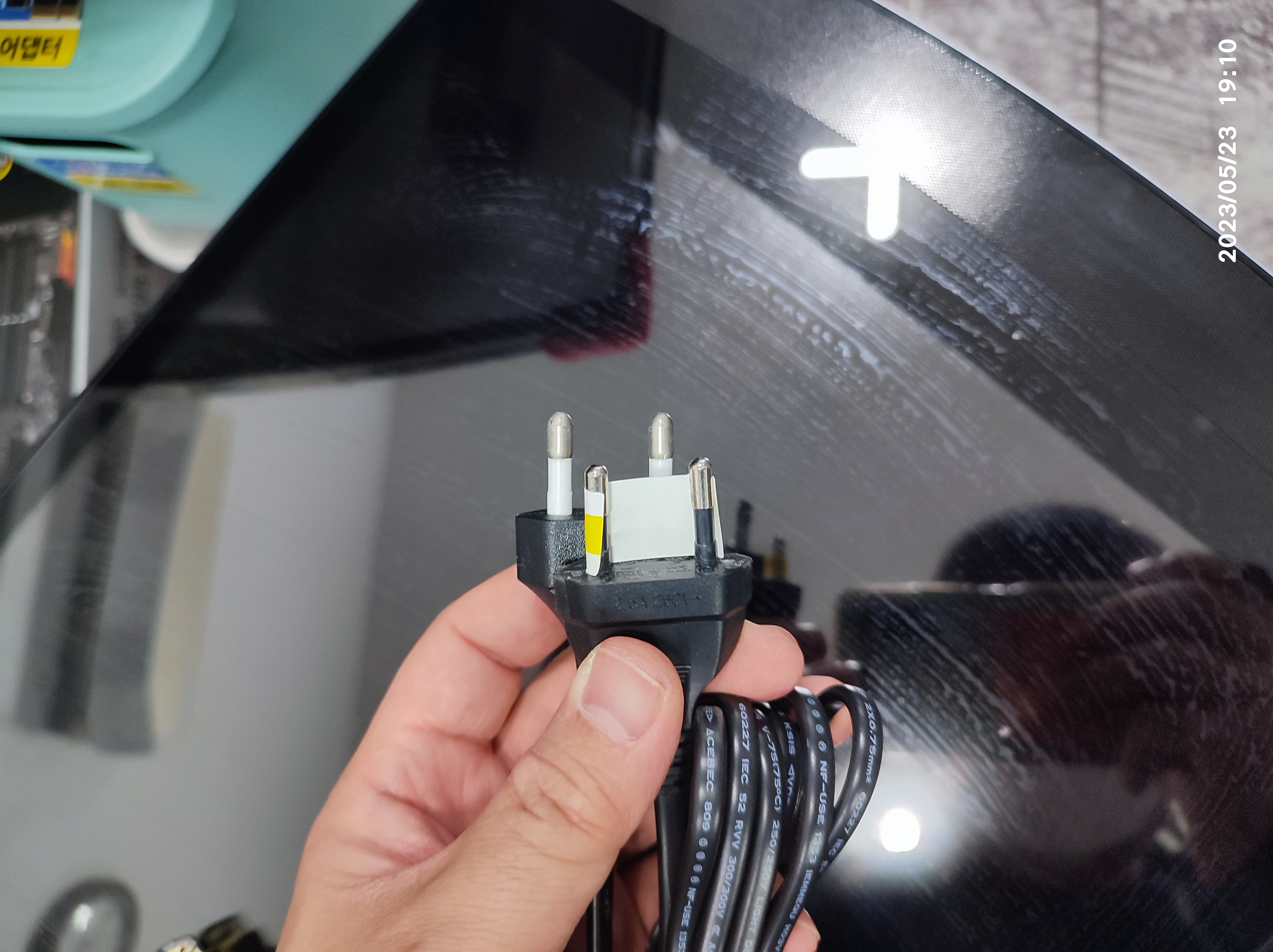 모니터의 전원선인데요. 코드의 규격이 국내 규격은 아니고 해외(유럽이나 중국 등) 규격의 얇은 코드를 가져오셨습니다. 8자 케이블, 2구 케이블도 국내(한국) 규격에 맞는 제품으로 구입해서 가셨습니다. 코드가 규격이 안 맞으면, 스파크가 튀는 등 다양한 전기적 접속 불량 증상을 만들 수 있습니다. 멀티탭을 살짝 건드렸는데, 컴퓨터 모니터 화면이 꺼진다든지 스파크가 튄다든지 등 전자 제품에 상당히 좋지 않은 영향을 끼칠 수 있고 멀티탭 소켓 과열의 원인이 될 수 있으니, 반드시, 국내 규격에 맞춰진 코드를 사용하는 게 좋을 거 같습니다. (동네 전파사는 거의 없어졌고 조명 매장이나) 동네 컴퓨터 매장에서 ~5천 원 사이에서 전기선을 구입하실 수 있습니다.