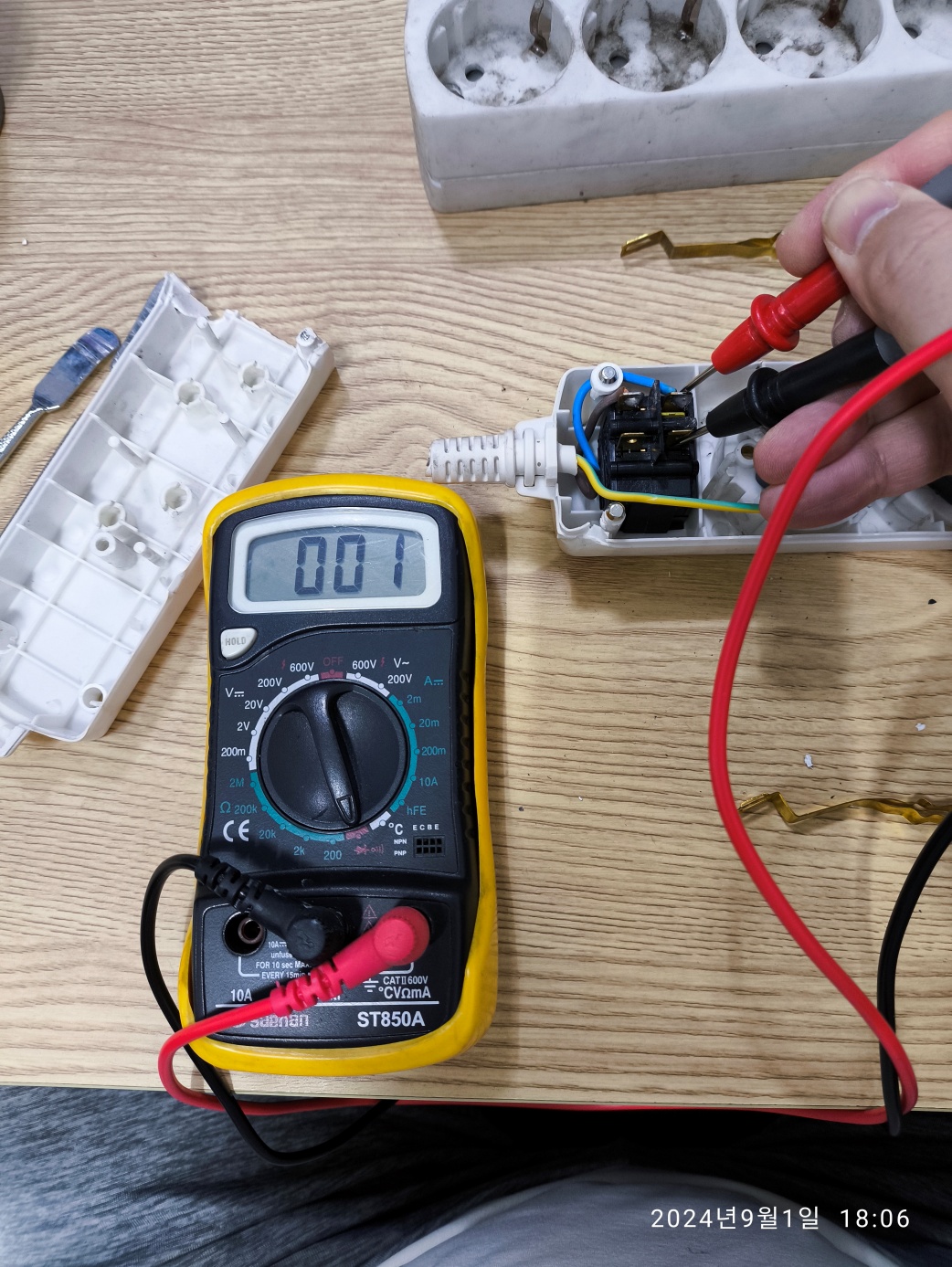스위치의 접점 테스트를 위해서, 테스트기 항목 중 쇼트되면 부저가 울리도록 맞춰두고 측정했습니다. 아래의 사진은 멀티탭 스위치를 OFF된 상태입니다.