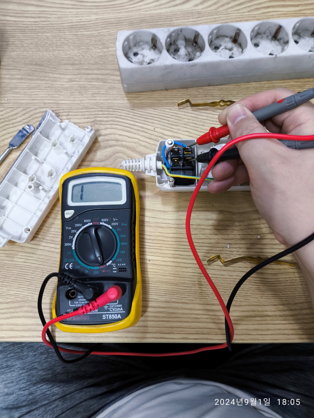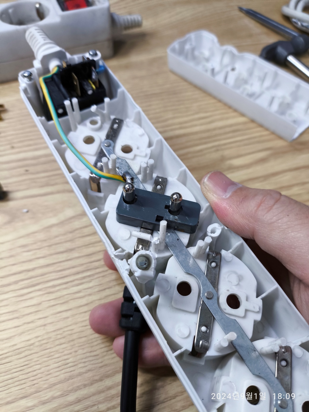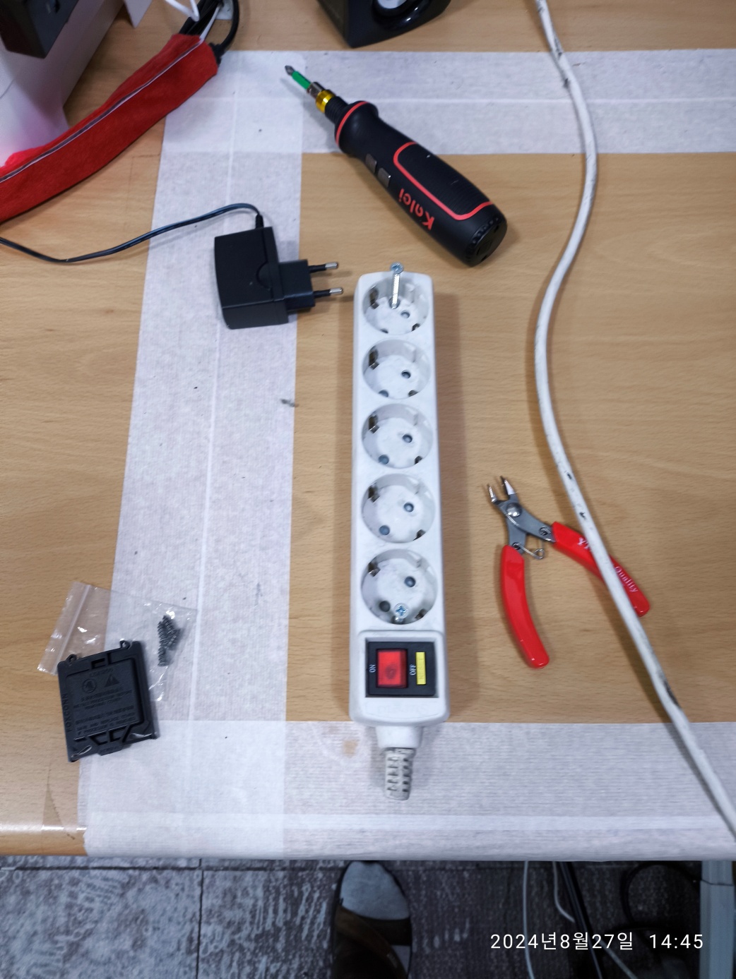 [주의] 멀티탭 제거할 때, 전기 코드를 뽑은 상태로 제거하세요. 이 멀티탭은 메인 컴퓨터 수리 작업대에서...
