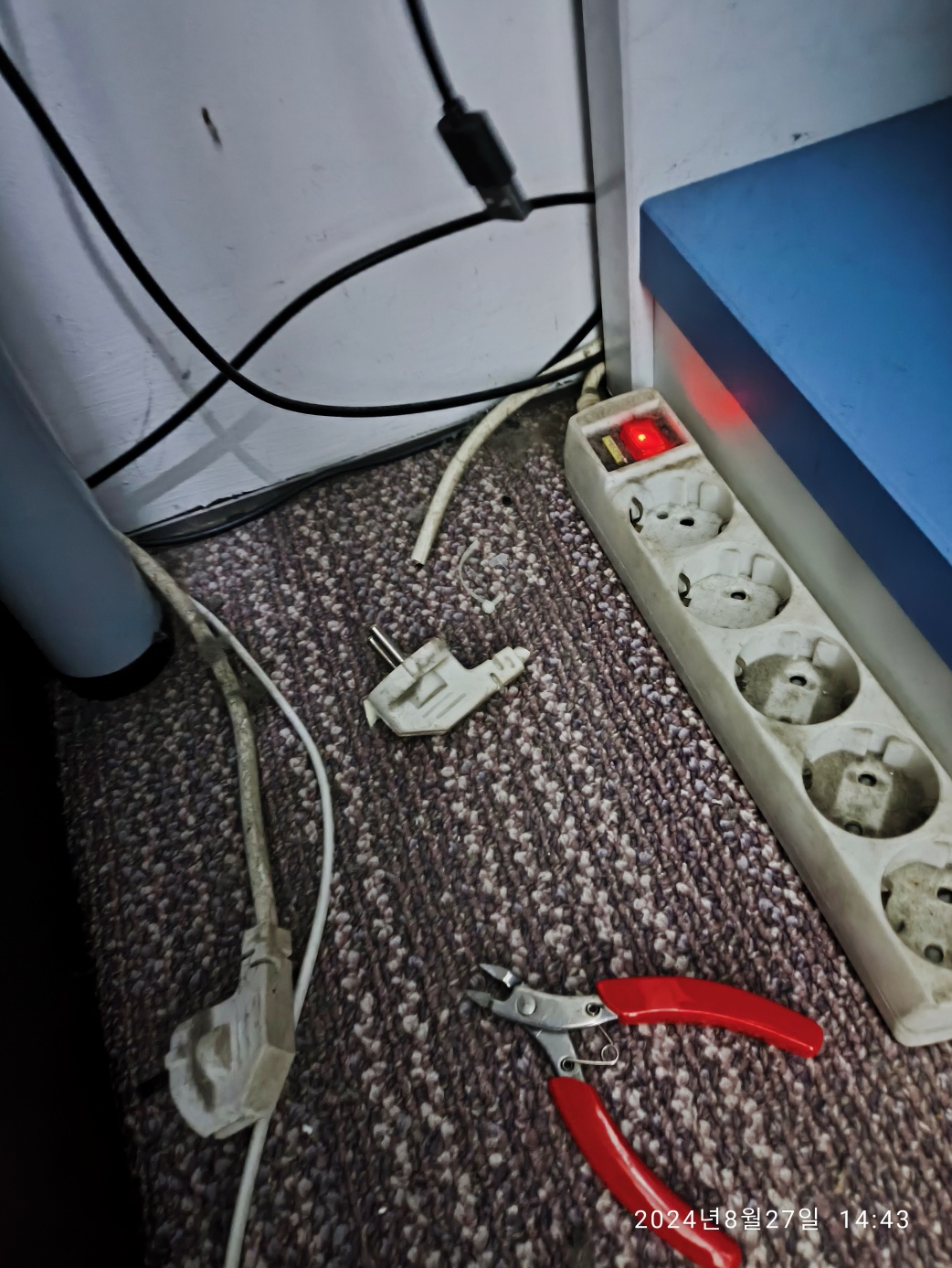 책상 밑에 바닥에 두고 사용한 멀티탭입니다. 소켓에 먼지가 많이 꼈습니다. 멀티탭에 또 멀티탭을 연장해서 매장 뒤편으로 연장한 멀티탭이 있는데, 전원 코드를 뽑고 전선 코드(헤드)만 니퍼로 커팅했습니다. 반대편에서 선을 당기면 안 쓰던 멀티탭 제거됩니다.