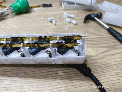 오래된 멀티탭은 분리 수거 및 내부 상태 확인을 위해서 분해했습니다. 멀티탭 분해는 전기를 꽂지 않고 분리된 상태로 분해해야 안전합니다. 전기가 연결된 상태로는 분해하면 절대 안 됩니다. 내부에 전기가 흐르면 합선 및 감전 위험이 굉장히 높습니다.