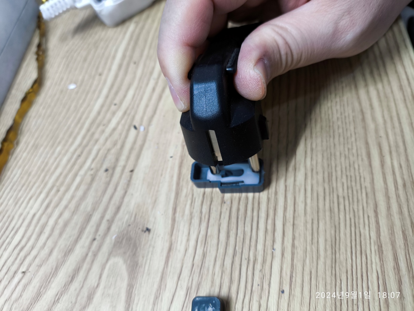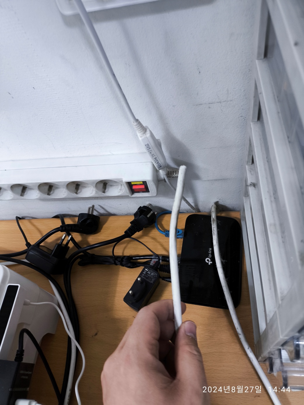 아래는 전기 코드가 멀티탭으로 들어올 때, 양쪽 코드가 같이 들어와서 마개가 열리는 걸 촬영한 사진입니다.
