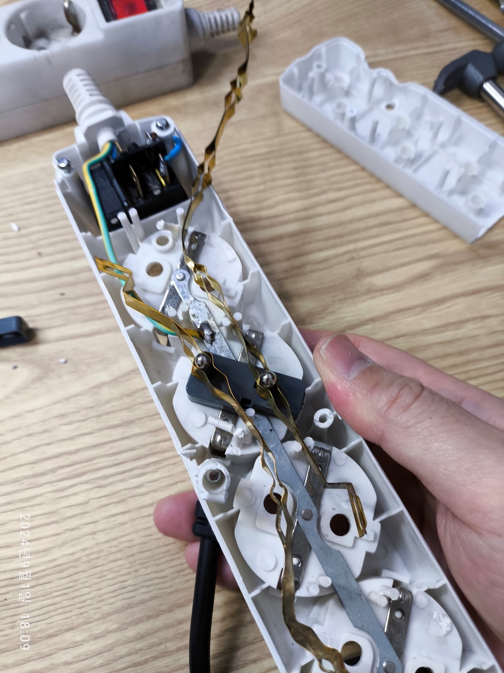 분해된 멀티탭의 부속들입니다. 전기가 통하는 소켓 부분은 구리이고 접지되는 부분은 철로 구성됐습니다. 그리고 스위치 중에서 접점 일부는 구리고 일부는 자석에 붙은 금속(판)입니다. 일부 금속판이 발열이 올라가면 휘어지는 특성이 있을 것으로 보입니다. 그래서, 온도가 올라가면, (전기 사용량이 올라가면) 금속판이 접점 반대편으로 휘면서, 스프링으로 눌려진 리셋 버튼이 위로 튀어 올라오면서 전원선 한 가닥이 차단되는 기능이 있는 듯 합니다.