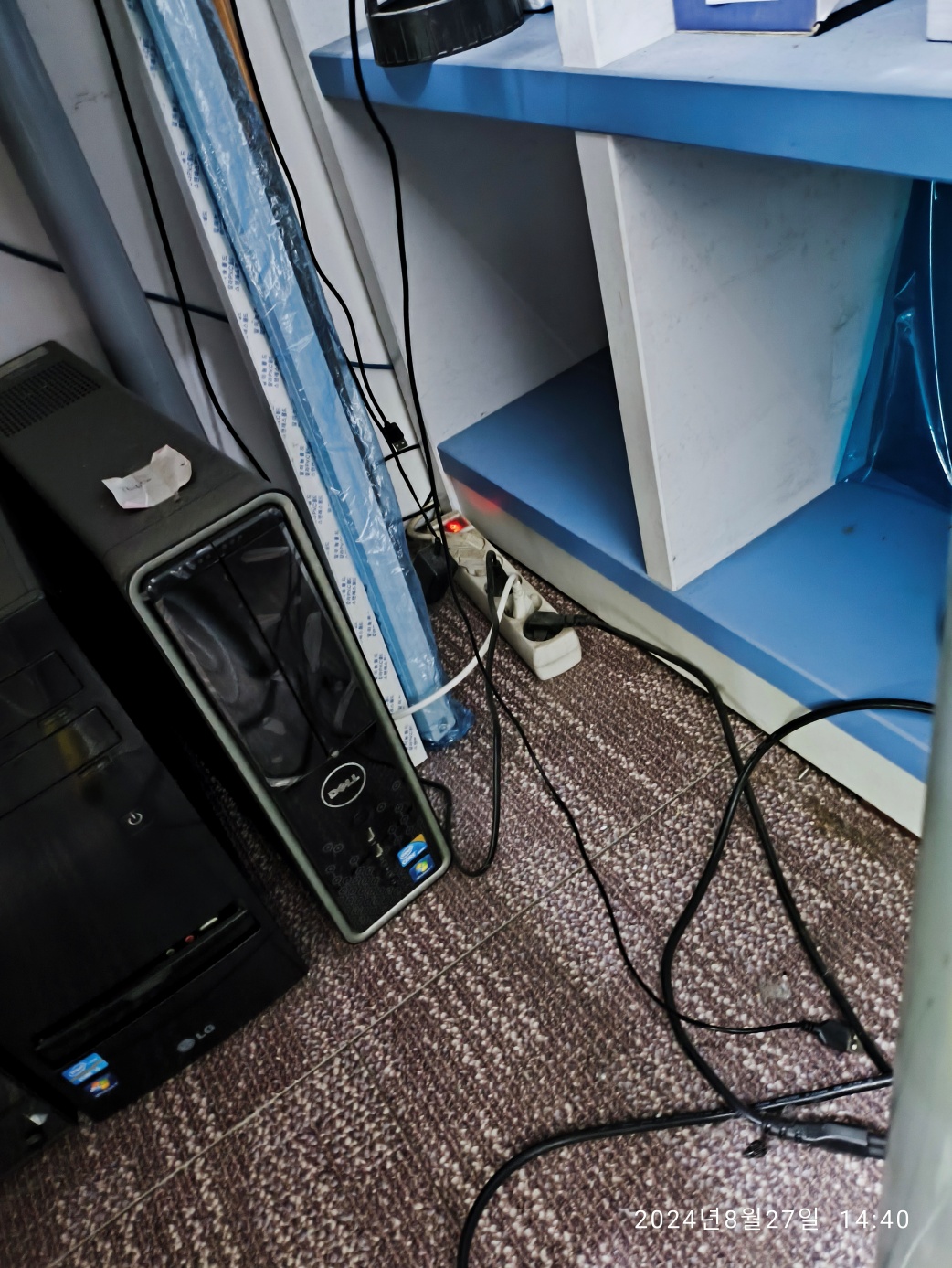 [주의] 멀티탭 제거할 때, 전기 코드를 뽑은 상태로 제거하세요. 이 멀티탭은 메인 컴퓨터 수리 작업대에서...