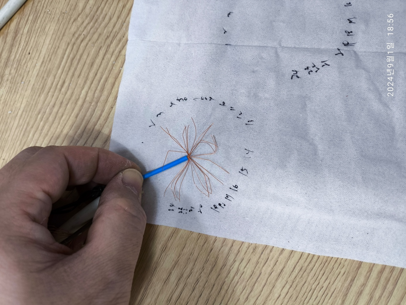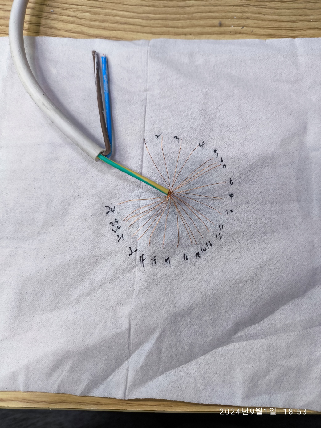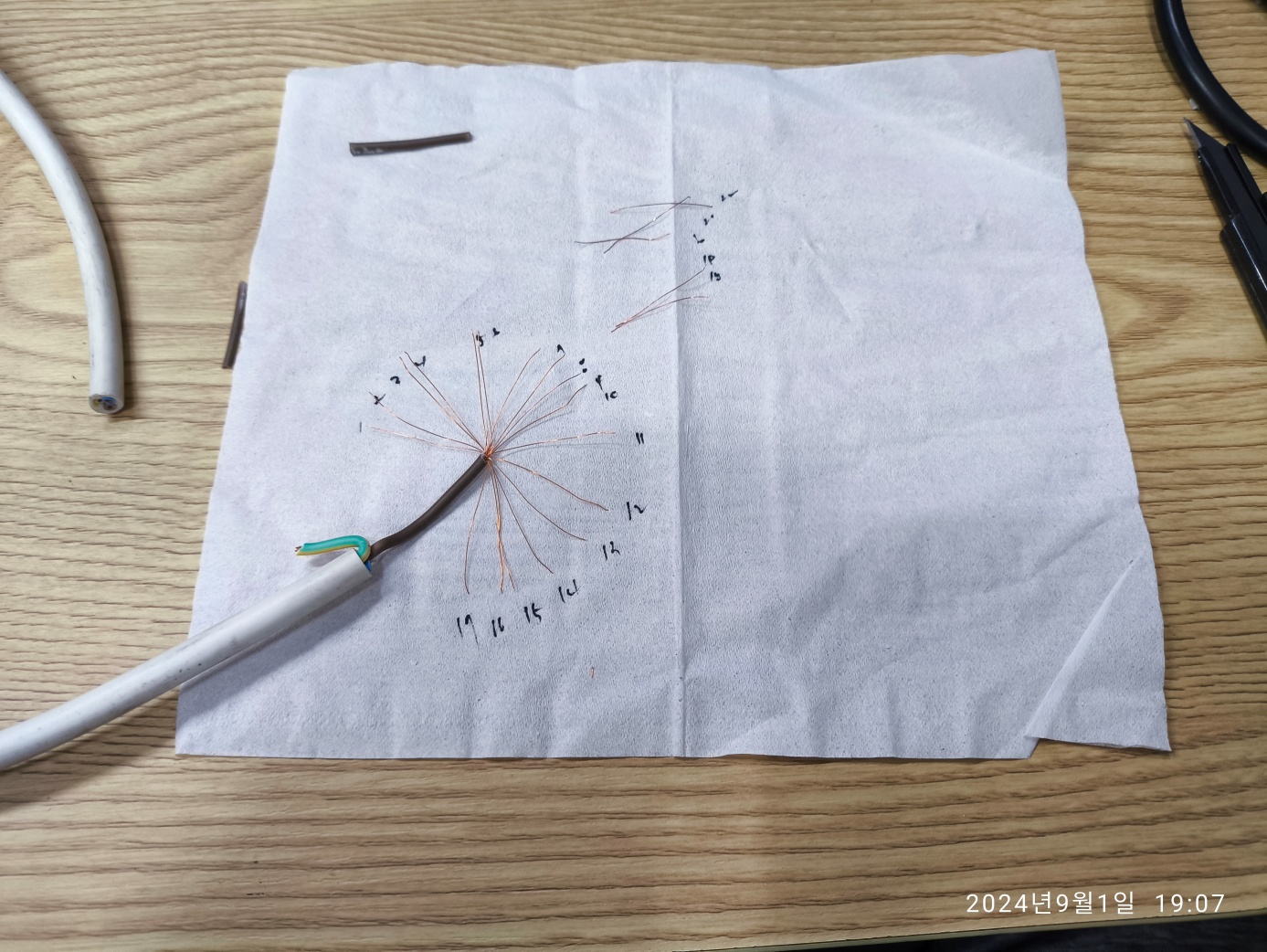 그리고 멀티탭 전선을 까서 내부의 전선 가닥을 세봤습니다. 접지, 전원선 2개 모두 24개의 전선 가닥입니다.