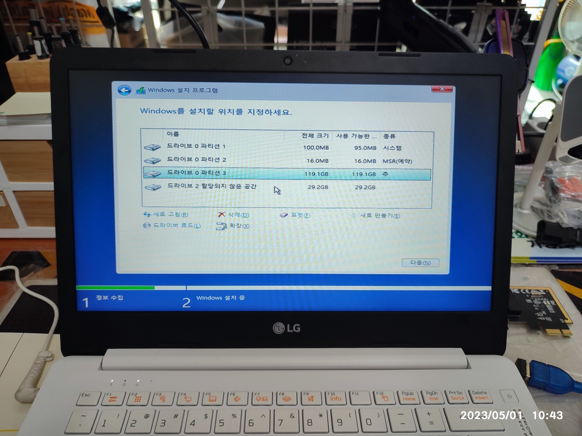 LG CMOS 설정화면으로 들어가서, 부팅 순서를 윈도우10 설치 USB로 변경하고 있습니다. 기존의 모든 파티션을 삭제하고 재설정하는 중입니다. 그래서, 자료는 백업 후에 컴퓨터 수리점을 찾아주시는 게 좋습니다. 자료를 별도로 백업해드리진 않습니다.