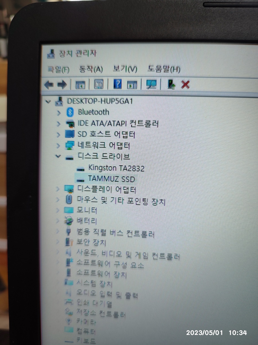 KingSton TA2832 (32GB 저장장치)와 TAMMUZ SSD 120기가 장치가 있습니다. SSD도 120기가면 오래된 제품입니다. 메이저 회사 (삼성, SK하이닉스) 제품도 불량나는데, 중소 기업은 더 높은 확률로 고장날 수 있으니, 항상 평상시에 정상적으로 동작될 때, 백업을 받으시는 게 좋습니다. 그리고 컴퓨터가 굉장히 느려지는 경우, SSD 불량을 의심할 수 있기 때문에, 부팅되고 정상적으로 데이터에 접근 가능할 때, 중요한 자료는 외장하드로 백업을 받으세요. 또는 웹하드로 업로드 바랍니다.