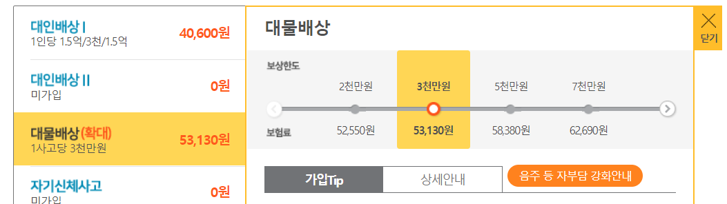 대인배상1, 2 가입, 대물 3천만원 => 14.5만 ![]() 대물배상 조건 변경시 아래와 같이 추가 요금이 있습니다. ![]() 처음 가입자는 해당 사항이 없는 거 같고요. 갱신 가입자만 해당되는 거 같네요. 아래와 같은 경고창이 뜨고 선택이 안 됩니다. ![]() |