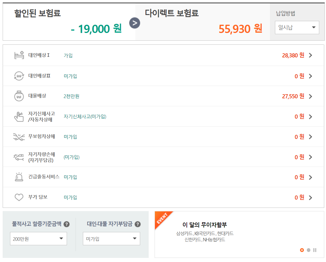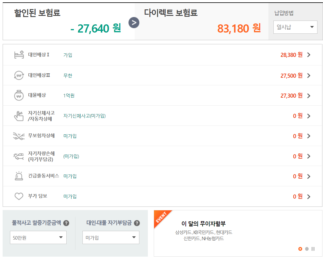 (물적사고 할증기준액 50만원) => 83,180원 ![]() (물적사고 할증기준액 200만원) => 86,980원 ![]() ![]() |