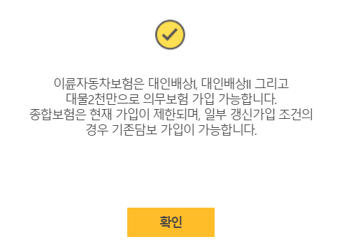 대인배상1, 2 가입, 대물 3천만원 => 14.5만 ![]() 대물배상 조건 변경시 아래와 같이 추가 요금이 있습니다. ![]() 처음 가입자는 해당 사항이 없는 거 같고요. 갱신 가입자만 해당되는 거 같네요. 아래와 같은 경고창이 뜨고 선택이 안 됩니다. ![]() |