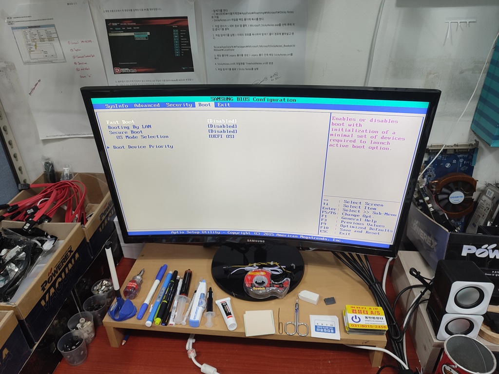 하드디스크에 데이터가 남아있기 때문에 포맷하지는 않은 상태인데요. 부팅 순서를 확인해 보니, 기존에 윈도가 설치된 하드디스크도 부팅 장치로 잡히고 있습니다. 기존 하드디스크로 부팅되지 않도록 사용 안 함으로 변경했습니다.