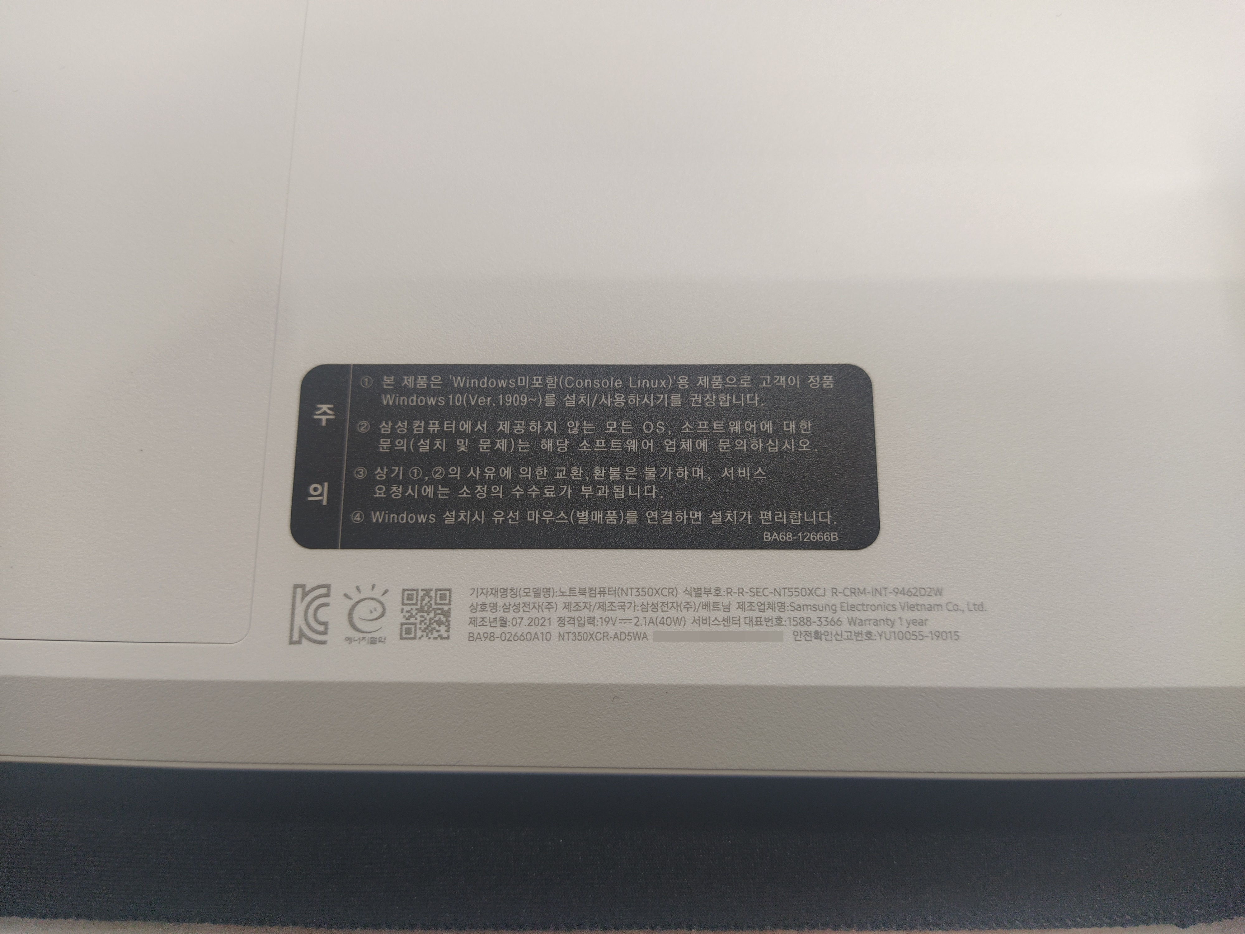 2021년 08월 12일 작업한 삼성노트북 신품입니다. NT350XCR-AD5WA 2021년 07월 출고된 노트북 => 정상 설치됨