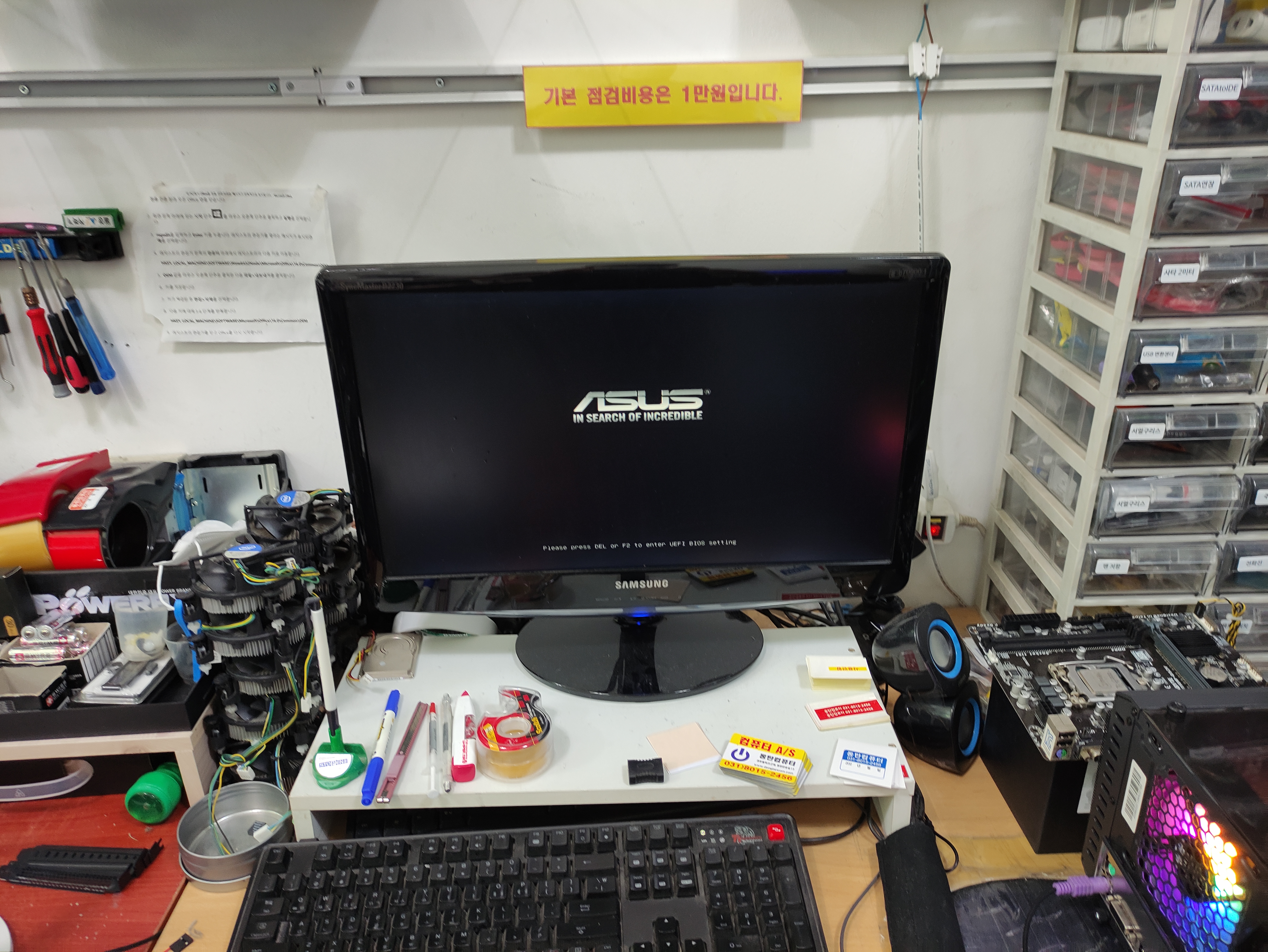 오늘 아침에 오신 고객님의 컴퓨터입니다. ASUS 화면에서 진행이 안 되는 증상으로 내방을 해주셨습니다. 메모리가 불량난 것으로 생각해서 메모리를 제거하고 한동안 잘 사용하시다가 오늘 아침에 아래와 같이 ASUS 화면만 뜨고 더 이상 진행이 안 되는 증상으로 찾아오셨습니다.