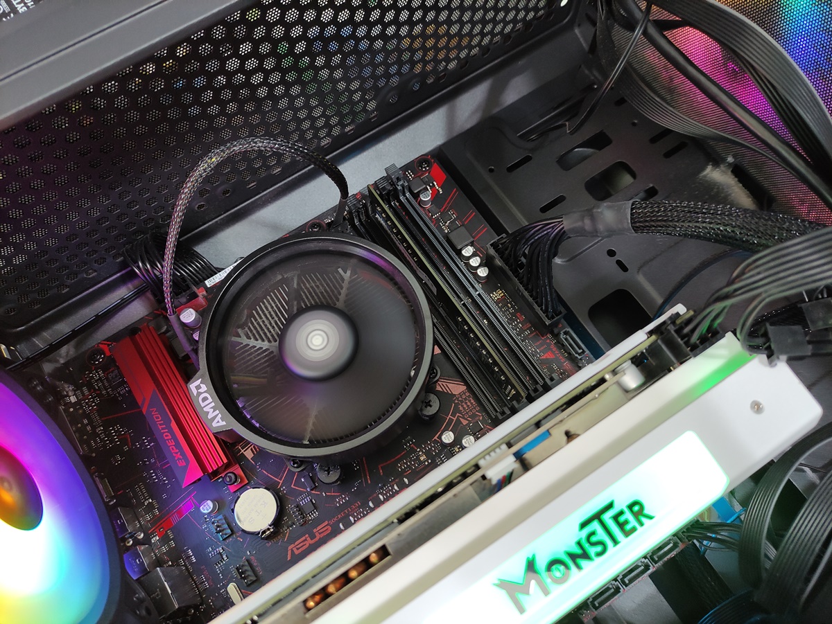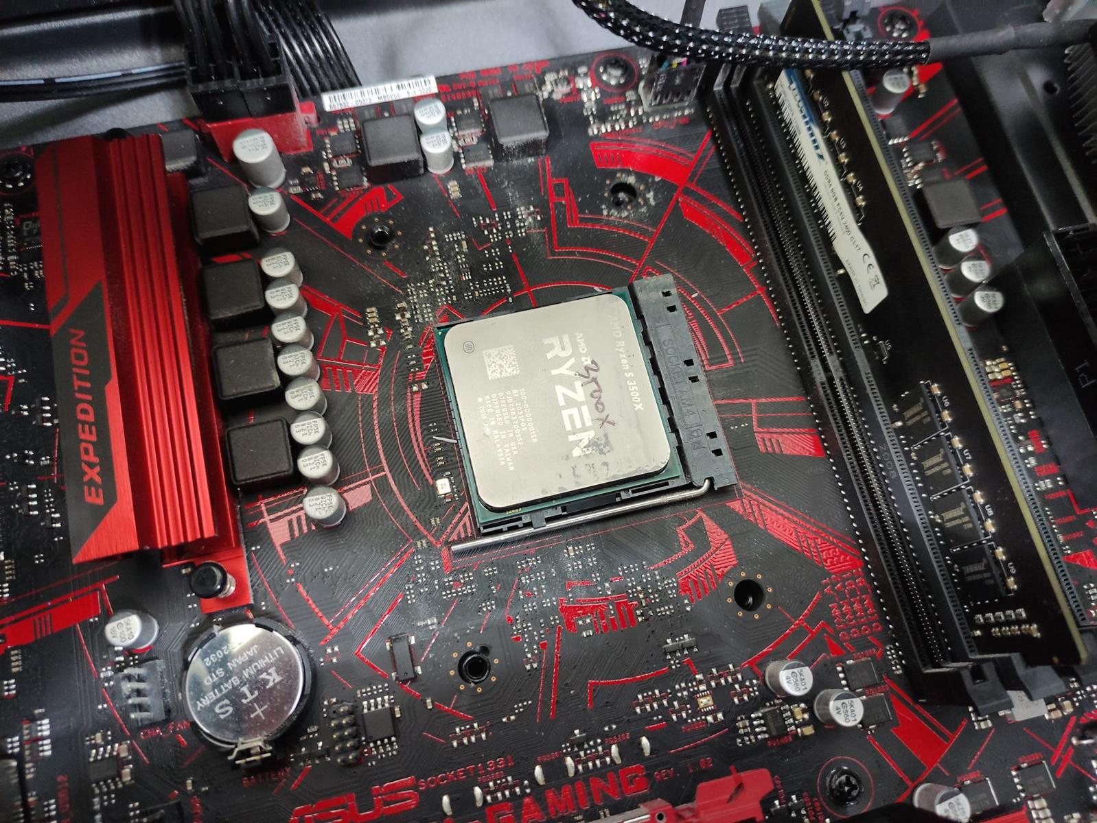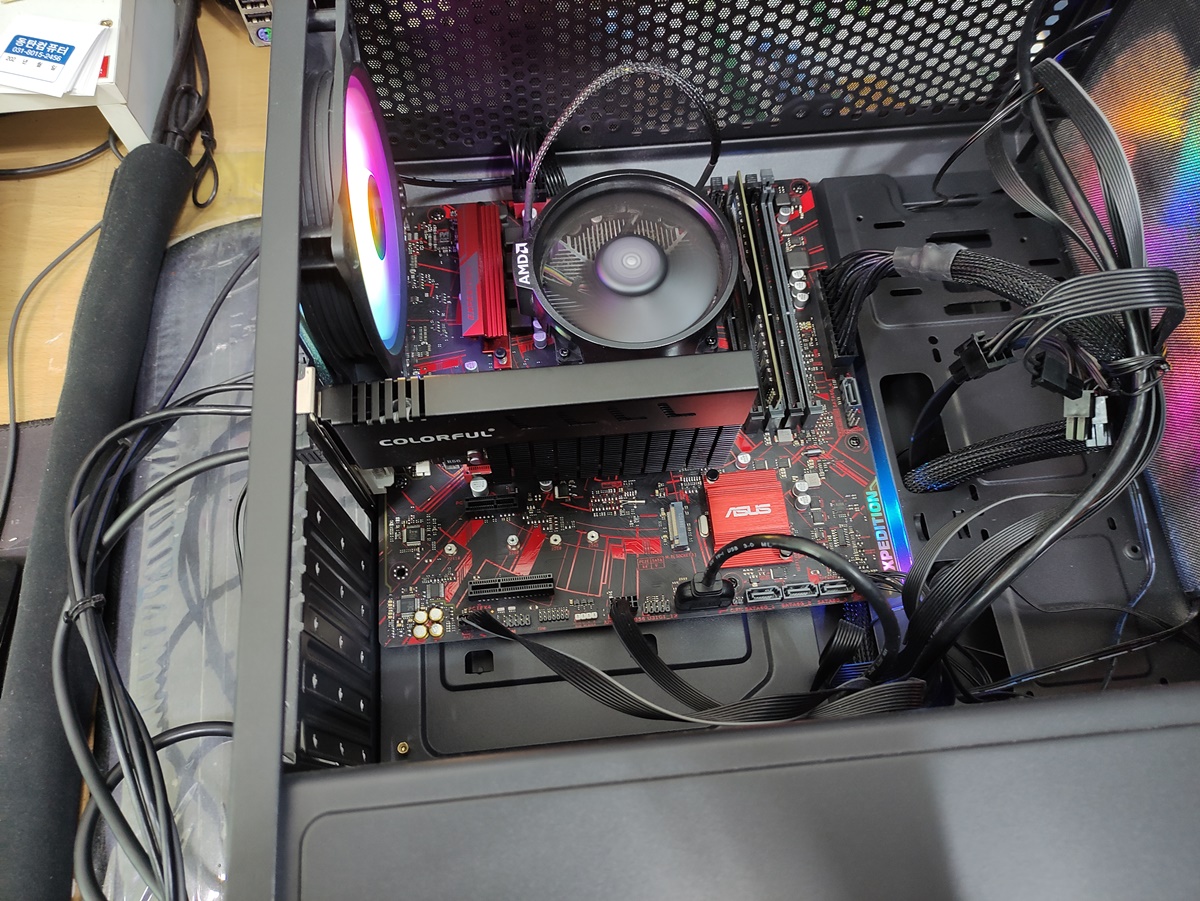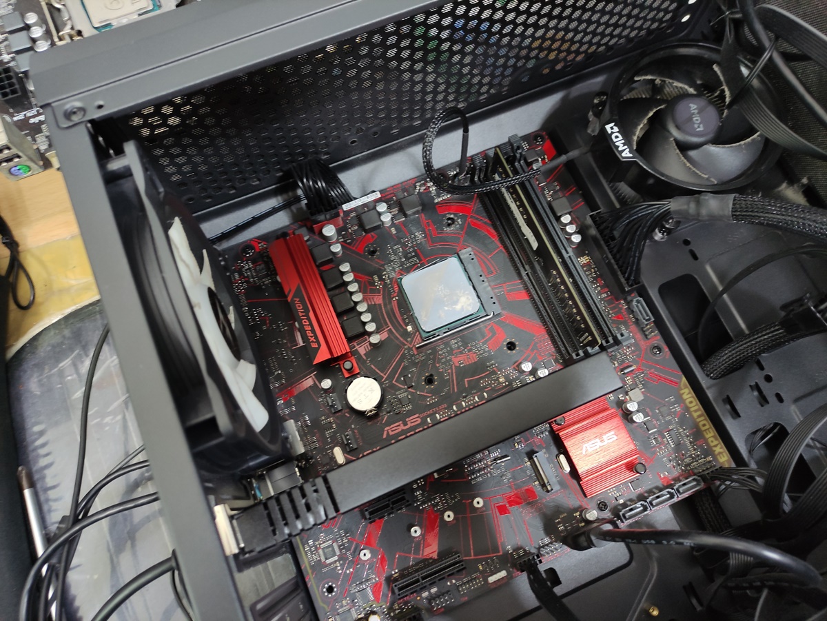 평상시에 정상적으로 사용했었던 A320M GAMING 메인보드로 테스트를 이어서 진행했습니다. (고객님과 같은 메인보드로 점검 진행) 아래와 같이 A320M GAMING 메인보드에 꽂아서 동일 증상이 구현됩니다. 제 메인보드에서 제 CPU (3600)을 장착하면 ASUS 화면에서 넘어가는데 고객님 3600을 장착하면 ASUS 화면에서 진행이 안되고 멈춥니다. 전원 버튼을 누르면 꺼지기는 하네요.