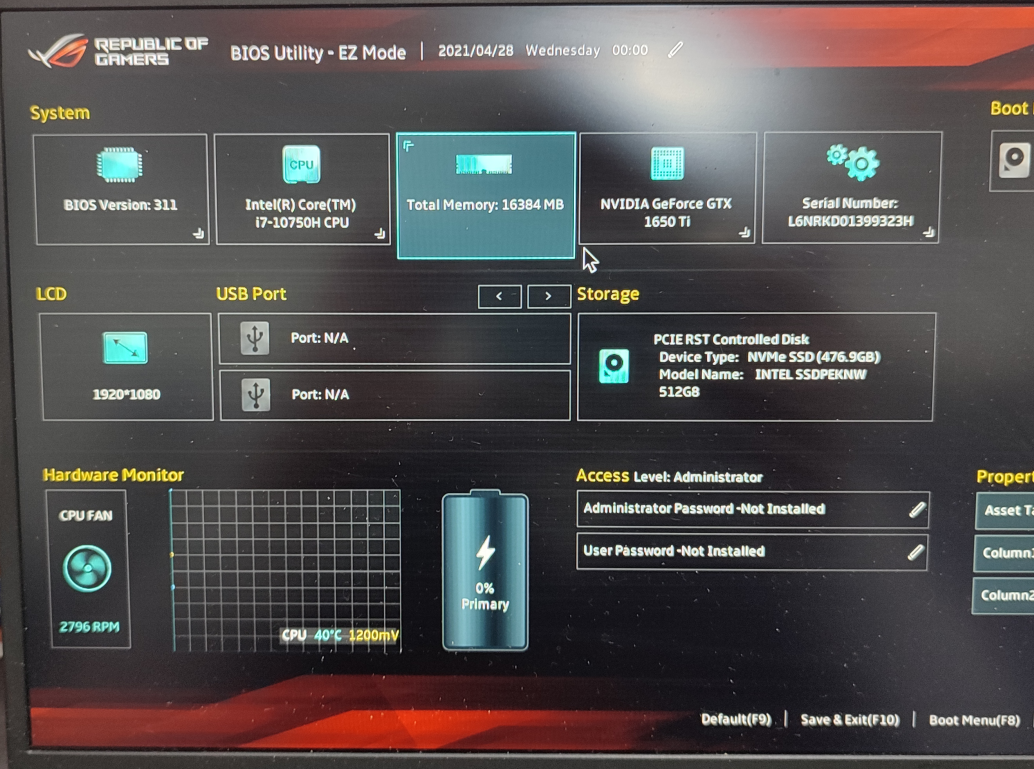 REPUBLIC OF GAMERS BIOS Utility EZ Mode 화면에서 업그레이드된 메모리의 용량을 확인하고 있습니다. 총 16기가만 표현이 되네요. 시모스 모드에서 메모리 종류는 확인이 안 됩니다.