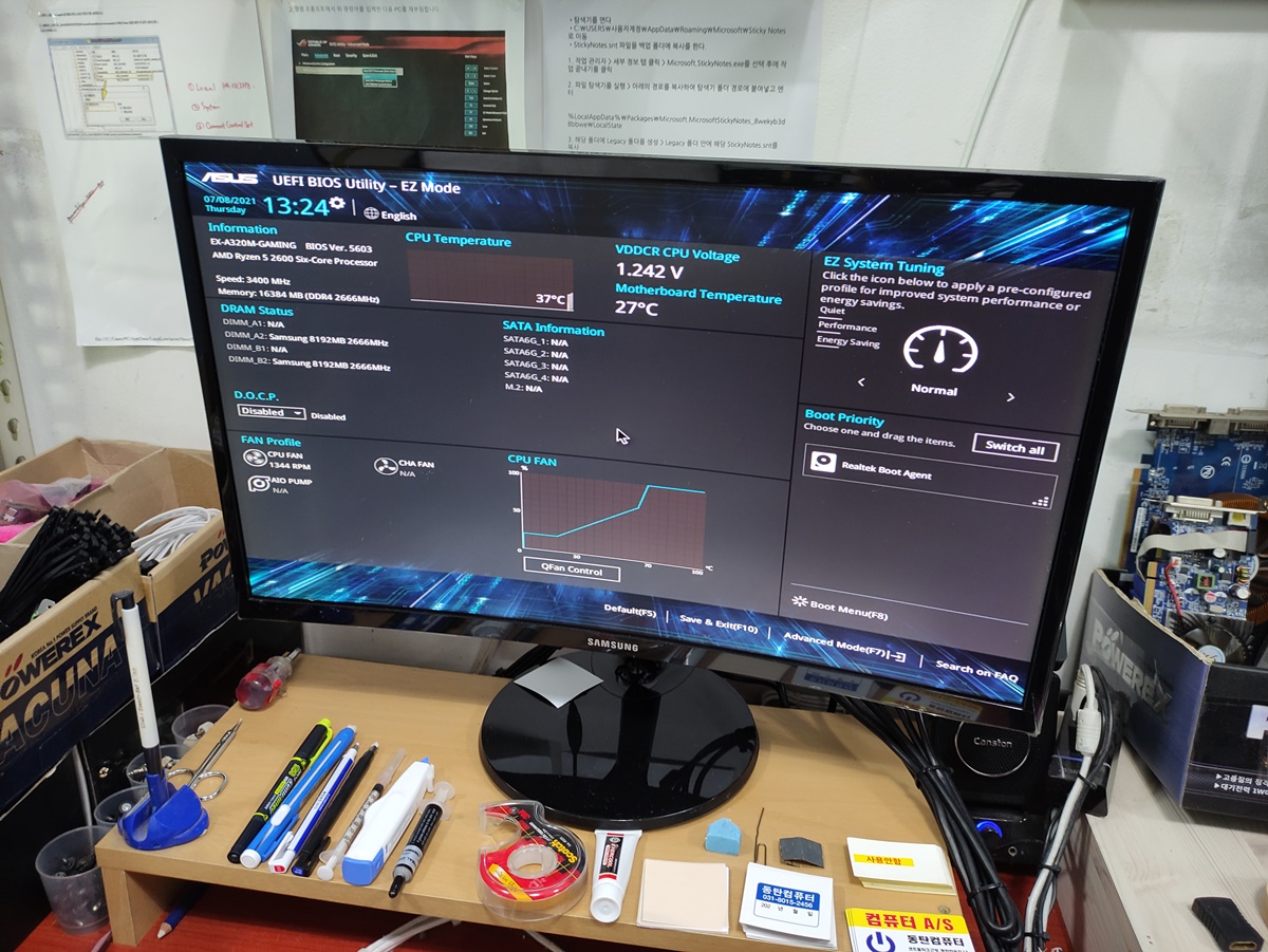 마침 매장에 같은 메이커의 같은 모델의 메인보드가 있어서 교차해서 테스트를 진행해볼 수 있었습니다. 손님의 CPU 라이젠 5 2600은 제 메인보드에서는 정상적으로 인식됩니다. 메모리 2개도 정상적으로 인식되는 모습입니다.
