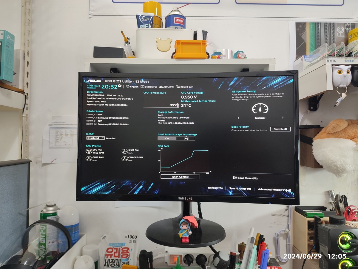 기존에 장착된 SSD가 저가형 제품이기도 하고 용량도 240기가 제품이라서, 메인보드에 직접 꽂을 수 있는 NVMe SSD로 업그레이드를 권장드렸습니다. SK하이닉스 P31 500GB SSD를 추가 장착했습니다. NVMe SSD가 첫번째 M.2 슬롯에서 인식이 안 되는 메인보드도 있기 때문에 먼저 제 M.2 SSD NVMe 120기가를 꽂아서 NVMe SSD가 정상적으로 인식되는 걸 먼저 확인하고 새 제품을 뜯어서 장착했습니다.