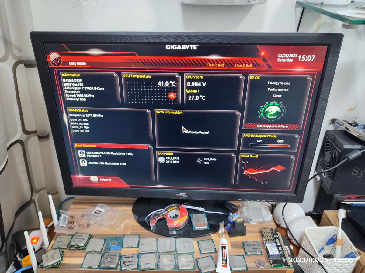 제가 테스트용으로 사용한 4600G CPU는 최근 바이오스 버전에서 인식되는 경우가 있습니다. (손님 메인보드를 추가 테스트하기가 겁나는 상황이지만), 마침, 제가 사용했던 A/S 기간이 조금 남은 3700X CPU가 있어서, 손님 메인보드에 3700X를 장착해서 테스트를 해봤습니다. => 손님 메인보드로 화면이 올라옵니다. => 최신 바이오스로 업데이트를 진행했습니다.