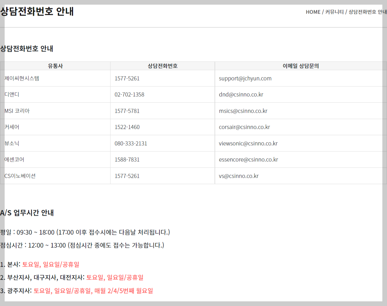(3) 아래는 CS이노베이션에서 A/S 가능한 제품의 리스트입니다. MSI, 기가바이트(제이씨현시스템) 담당 부서로 전화해서 시리얼 넘버로 A/S가 가능한지 먼저 확인해 보실 거 같습니다. 시리얼 넘버 조회가 안되면, 다른 유통사에서 판매한 제품입니다. 유통사를 찾아서 A/S를 보내셔야 합니다.