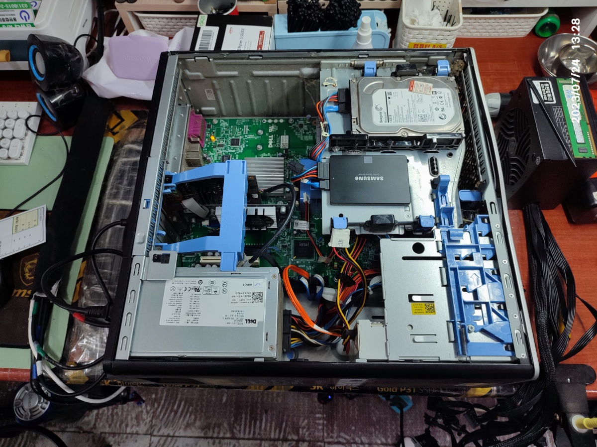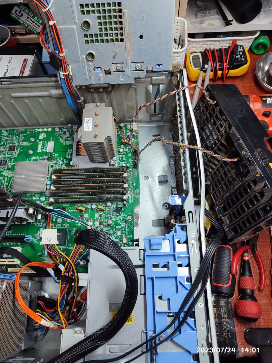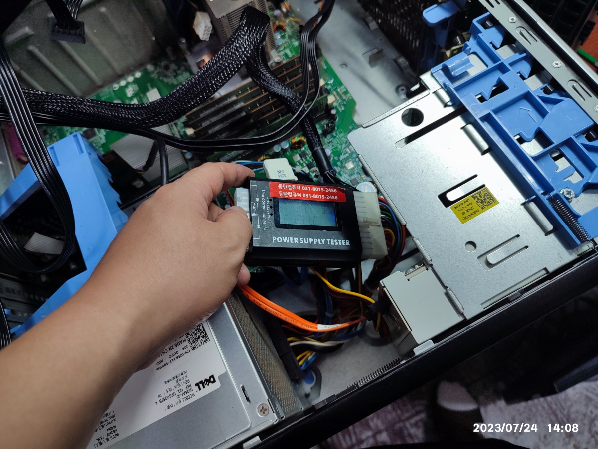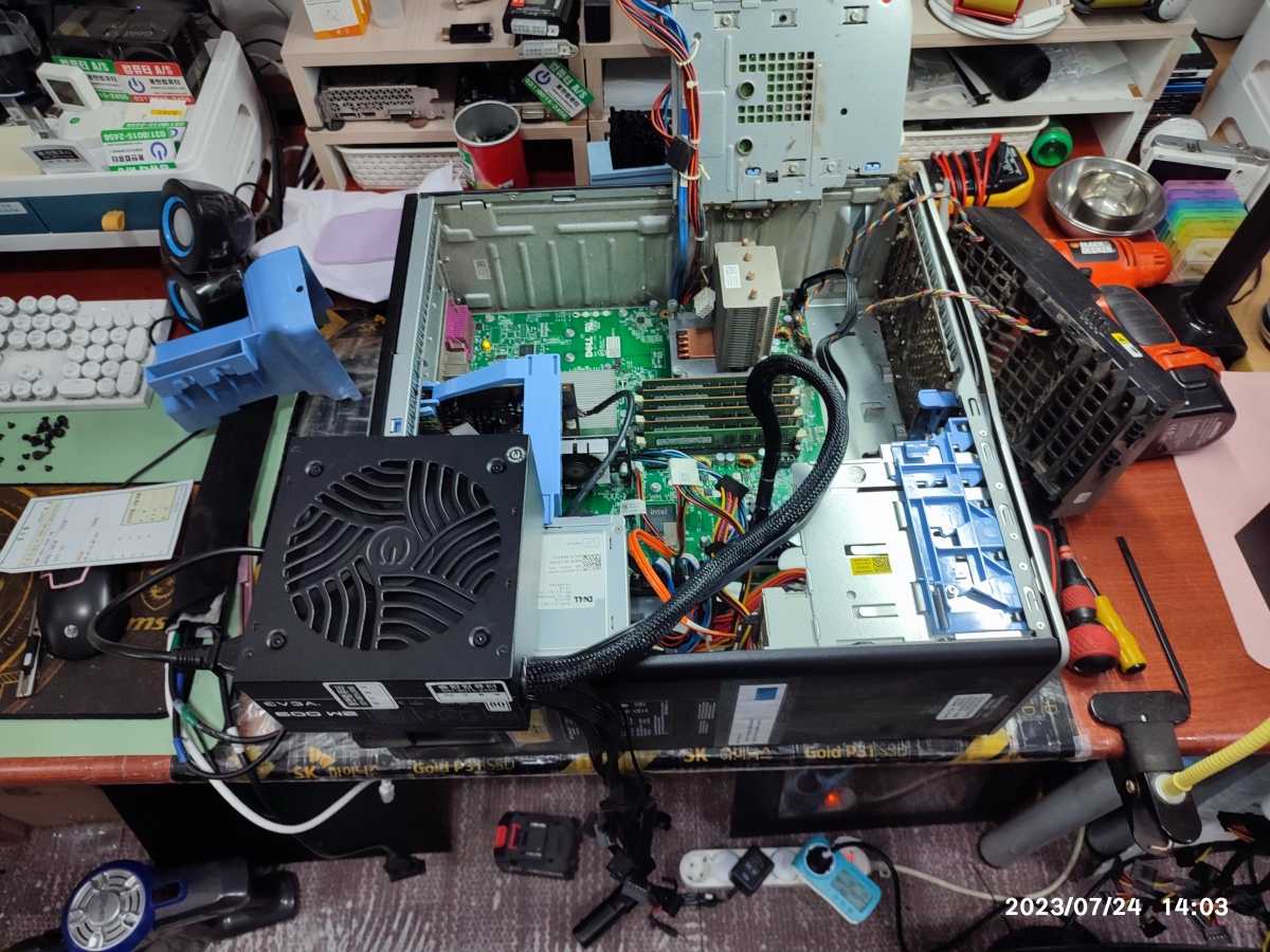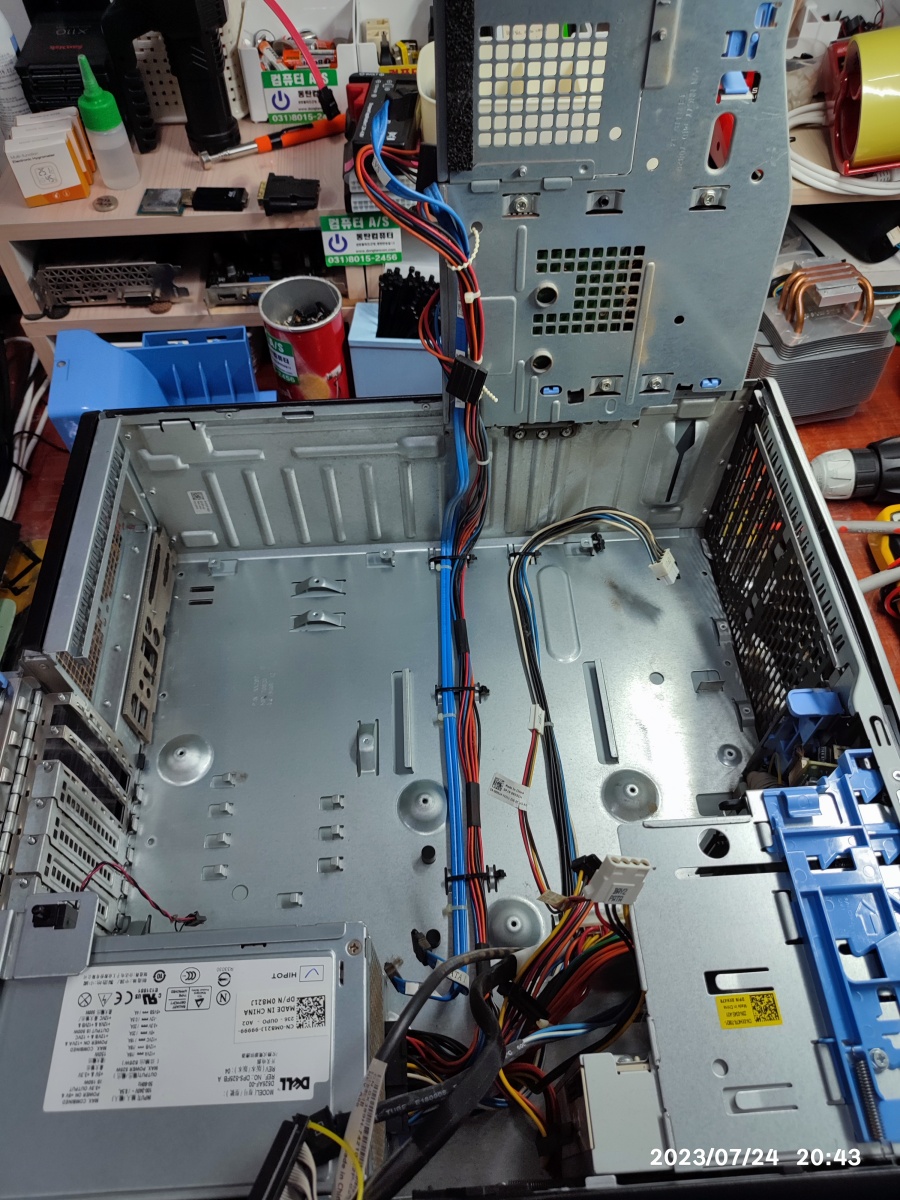 2023년 07월 24일 입고된 델컴퓨터입니다. 서버급의 크기입니다. 컴퓨터 수리대 올려 놓으면 밖으로 삐져나옵니다. 무게도 무거워서 무릎 굽혀서 들지 않고 잘못 들면 허리 다칠 수도 있습니다.