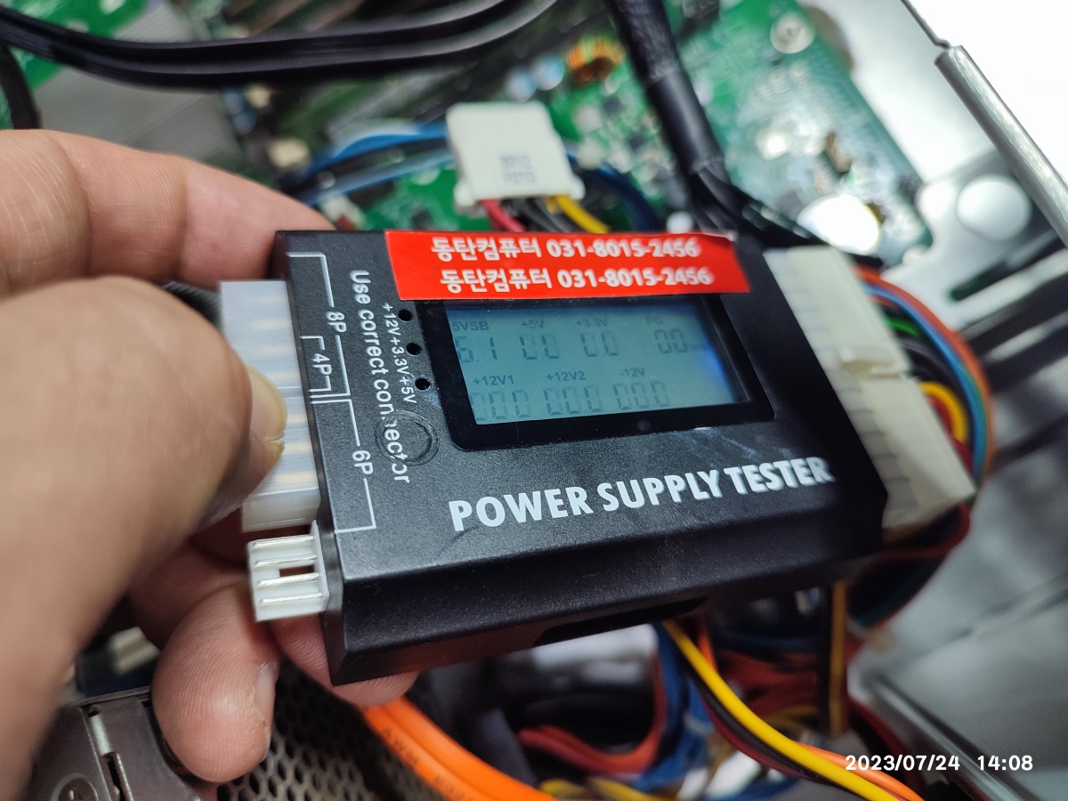 기존에 장착된 파워서플라이를 테스트기에 연결해봤습니다. 아래와 같이 LL(전압이 낮다고)이 많이 뜨네요. 액정도 희미해서 눕혀서 봐야 숫자가 읽어집니다.