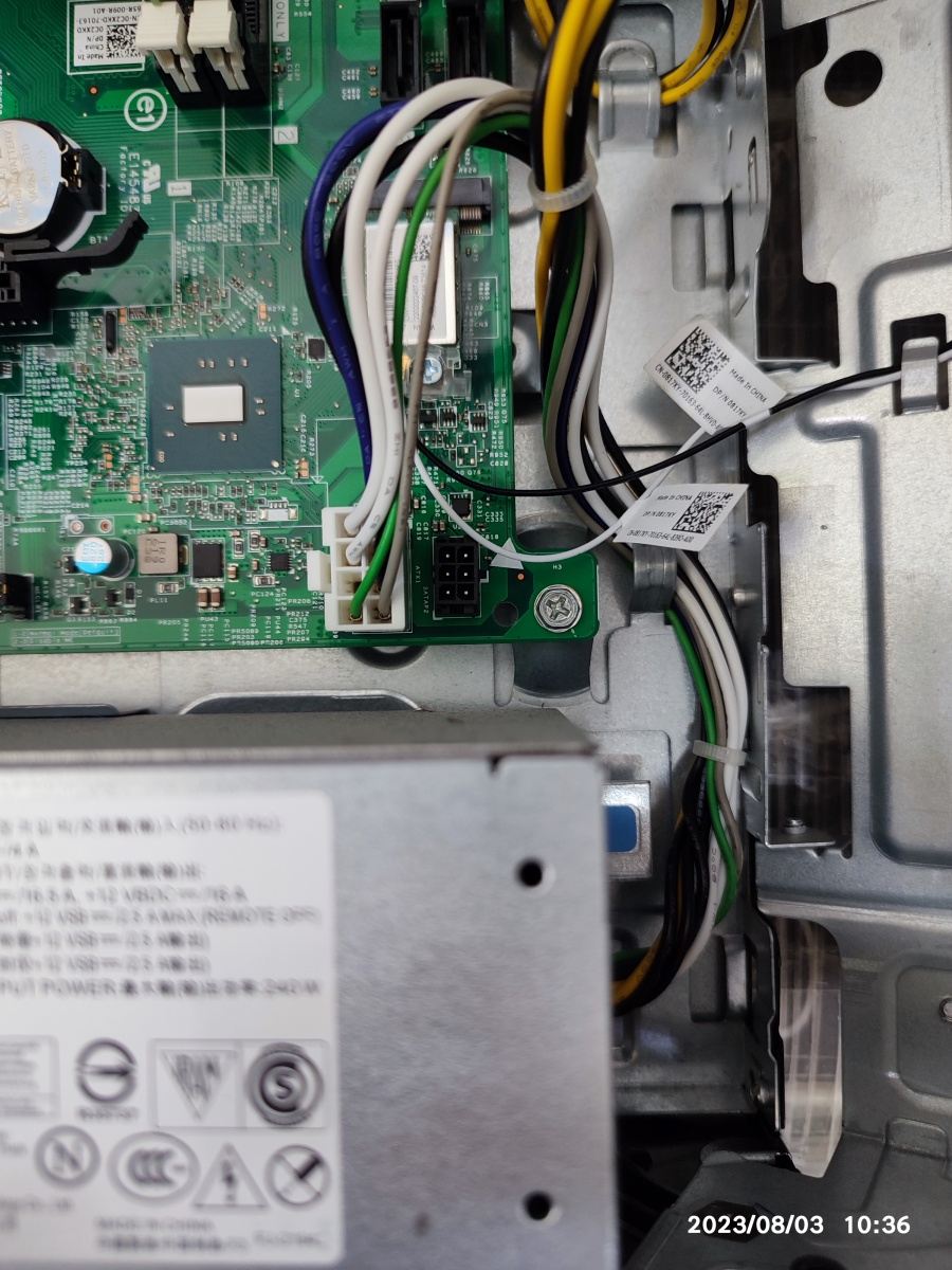 메인보드 기판 밑으로 전선을 깔아둔 상태입니다. 풀 모듈러 방식의 케이블인데요. 만약, 동일한 파워서플라이가 있다면, 파워서플라이 유닛만 단독으로 교체할 수 있어서 편리합니다. 이렇게 선을 걷어낼 필요가 없습니다. 이 컴퓨터가 생산된지도 10년은 된 거 같은데요. 여기에 맞는 파워를 아직도 생산하고 있을지 모르고 만약, 있다고 하더래도 파워만 구입 가능할지? 구입 비용은 얼마나 나올지 모르겠네요. 제 개인적으로는 시중에 판매되는 조립 컴퓨터용 ATX 파워서플라이로 교체할 거 같습니다. 정격 500W이상으로 교체하면 될 거 같습니다. 그래픽카드가 게이밍 그래픽카드가 장착된 상태라면, 정격 600W이상으로 교체할 거 같습니다. 그래픽카드 종류에 따라서 적절한 파워 용량으로 가시면 될 거 같네요.