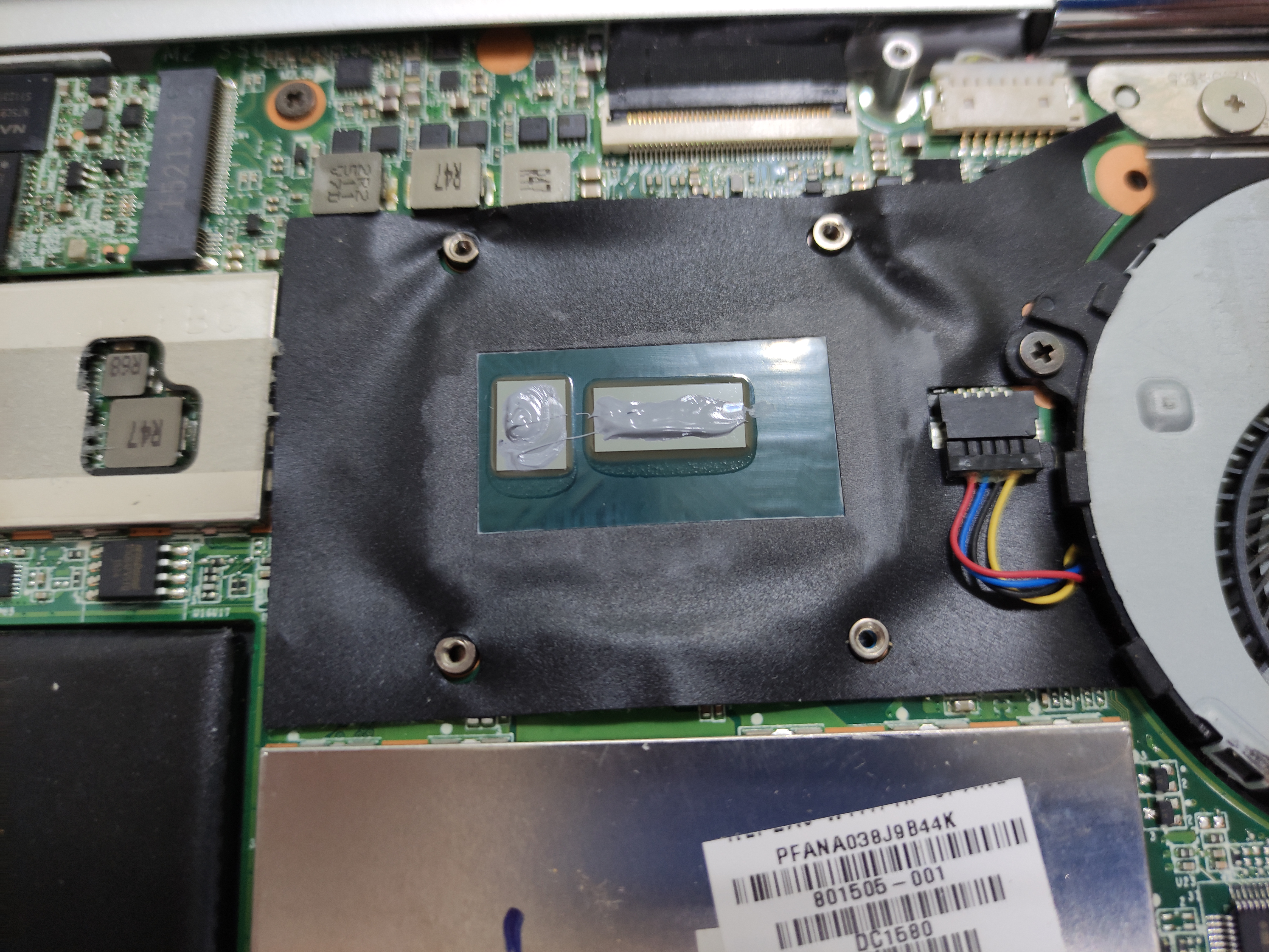 (Disconnect the battery cable and disassemble it.) This is the image of the laptop and the board. There's a lot of heat generating near the CPU heat shield. The heat shield of the CPU is ripped off for the thermal grease re-application operation of the CPU.