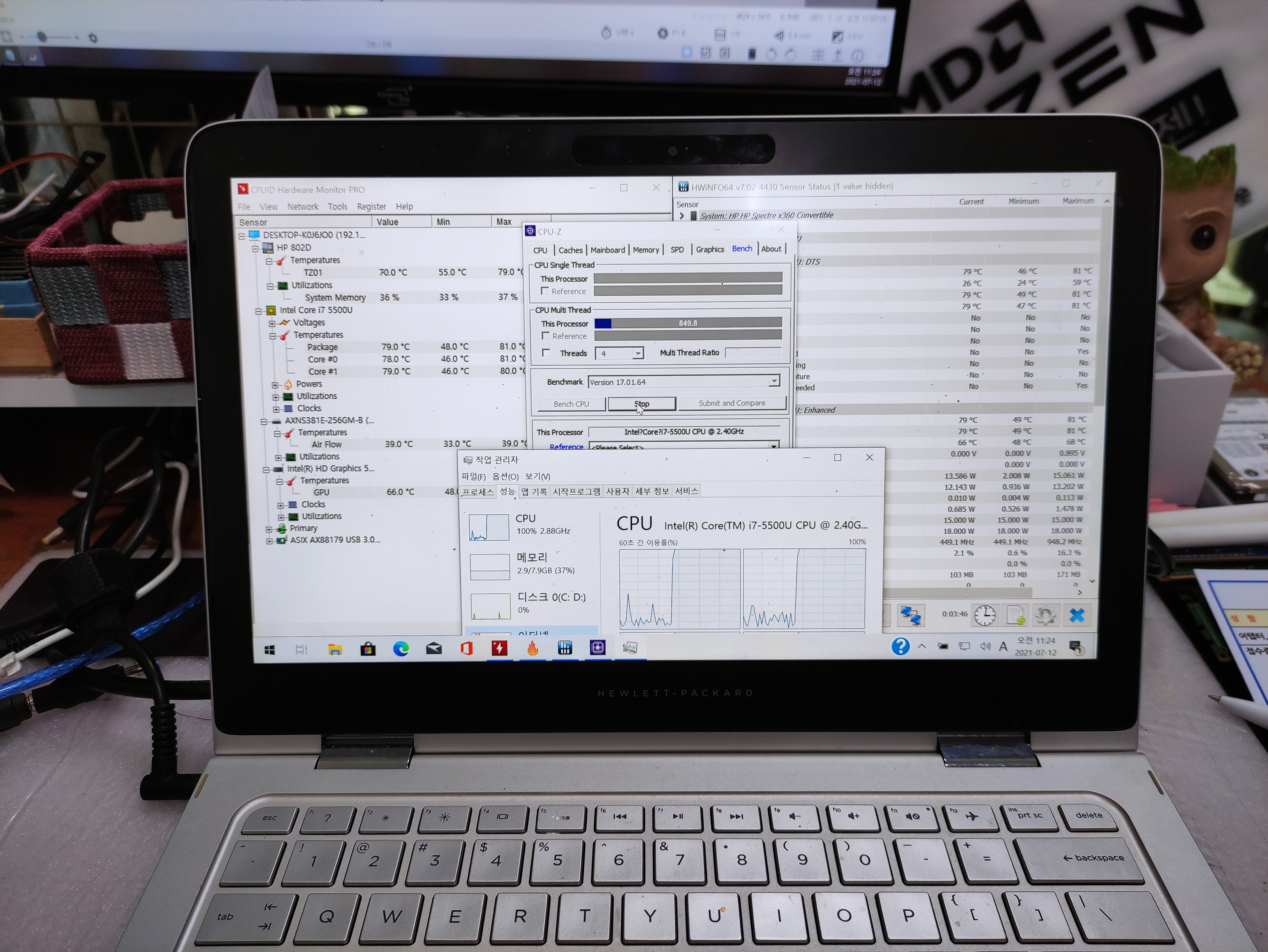 HP laptop with i7-5500U (2.40 GHz) CPU. The laptop was so hot that you gave me a room. Using the CPU-Z program, I stressed the CPU utilization to operate at 100%. I tried to operate the CPU at full speed for 30 seconds. The temperature is close to 90 degrees. If we did it a little longer, I think it would have been over 90 degrees. For no reason, I stopped at about 30 seconds and proceeded with the thermal copper re-application because I thought it would cause problems with the CPU due to overheating.
