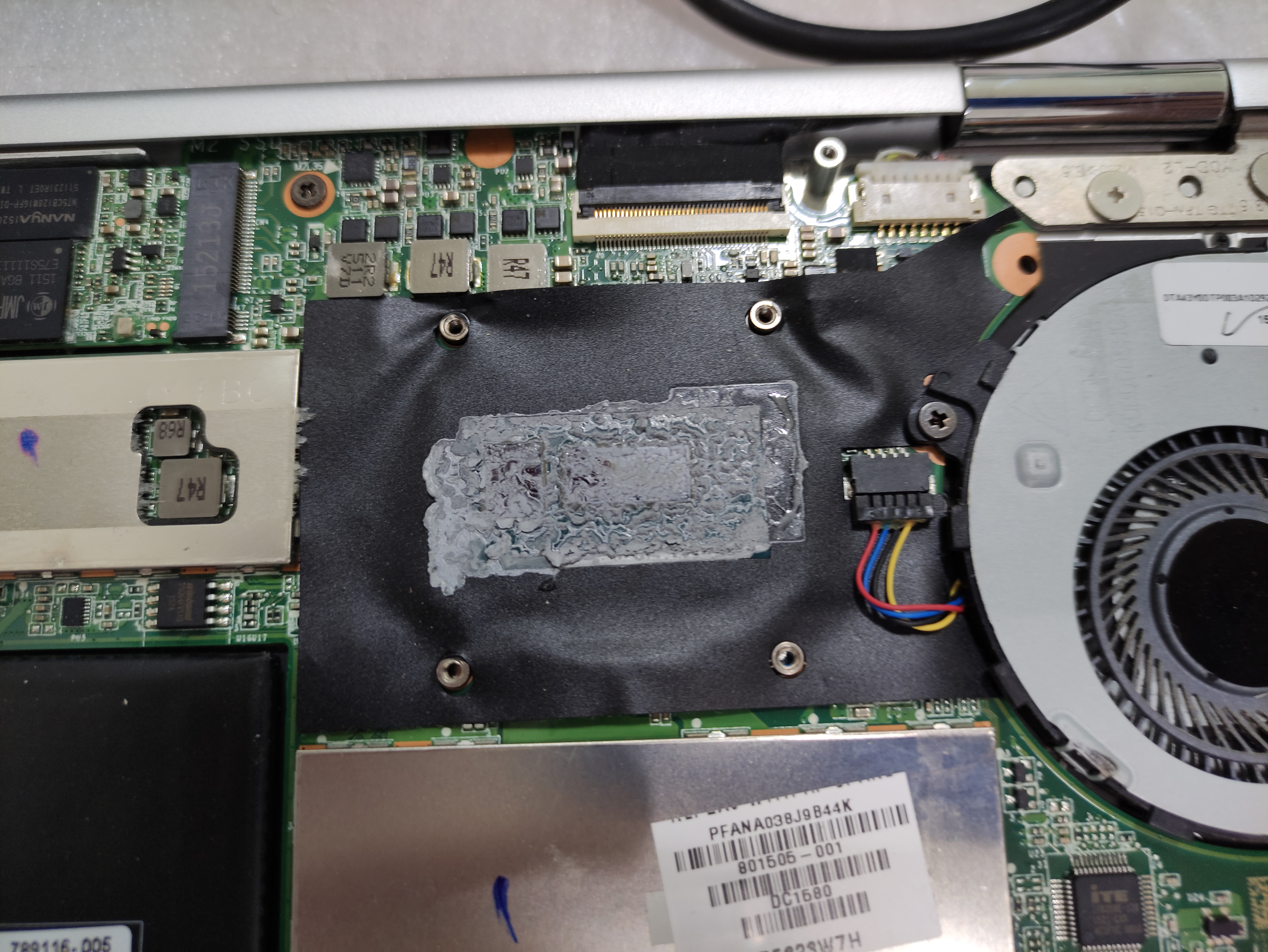 서멀 컴파운드는 노트북이 출시될 당시의 상태로 그대로입니다. 5년 정도 사용하신 노트북이라고 합니다. 열전도하는 액체가 아래처럼 말라서 굳으면, 열전도가 잘 안되기 때문에, 1년에 한 번 정도 관리(재도포)를 해주시면 좋습니다.