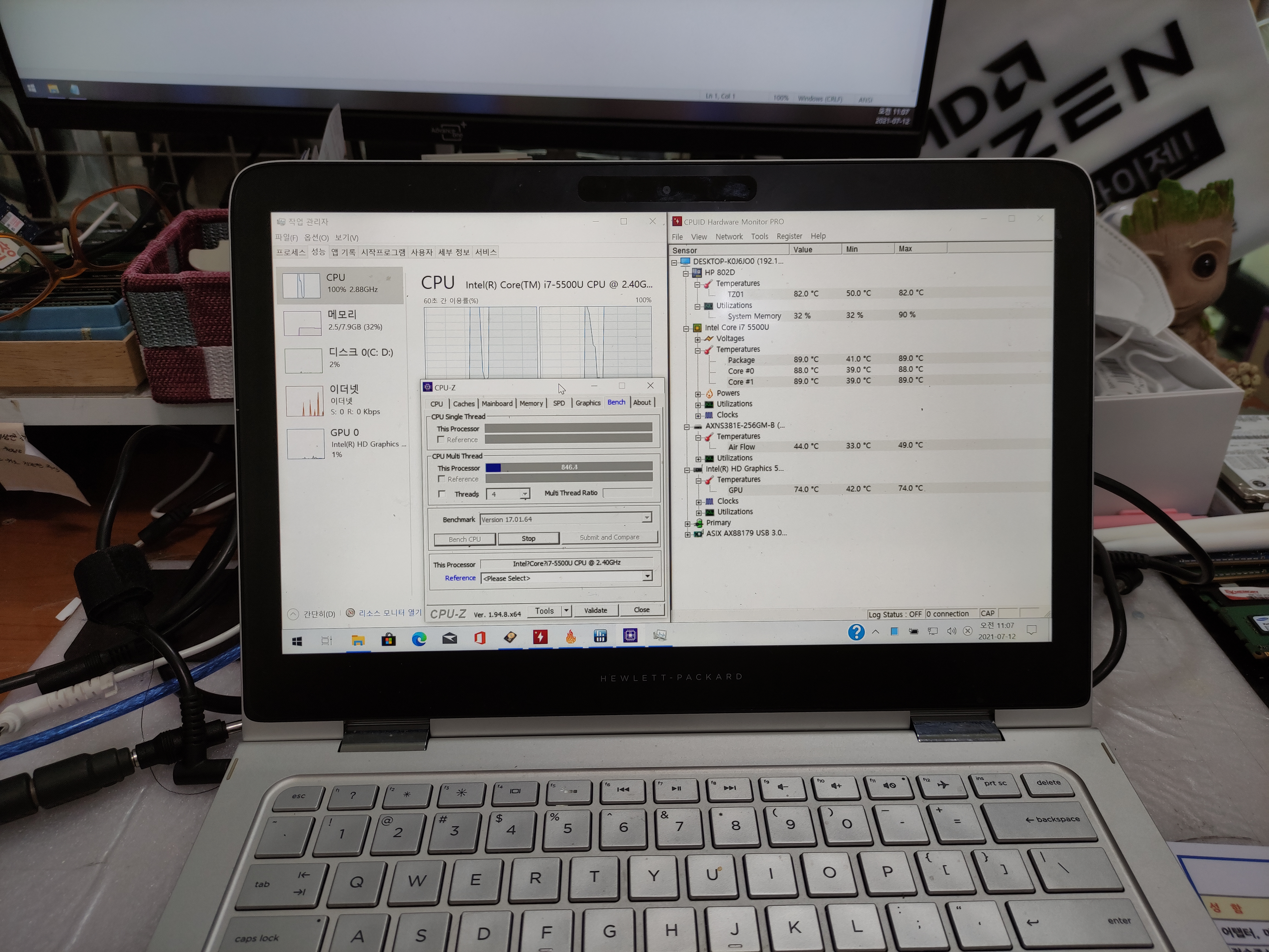 HP laptop with i7-5500U (2.40 GHz) CPU. The laptop was so hot that you gave me a room. Using the CPU-Z program, I stressed the CPU utilization to operate at 100%. I tried to operate the CPU at full speed for 30 seconds. The temperature is close to 90 degrees. If we did it a little longer, I think it would have been over 90 degrees. For no reason, I stopped at about 30 seconds and proceeded with the thermal copper re-application because I thought it would cause problems with the CPU due to overheating.