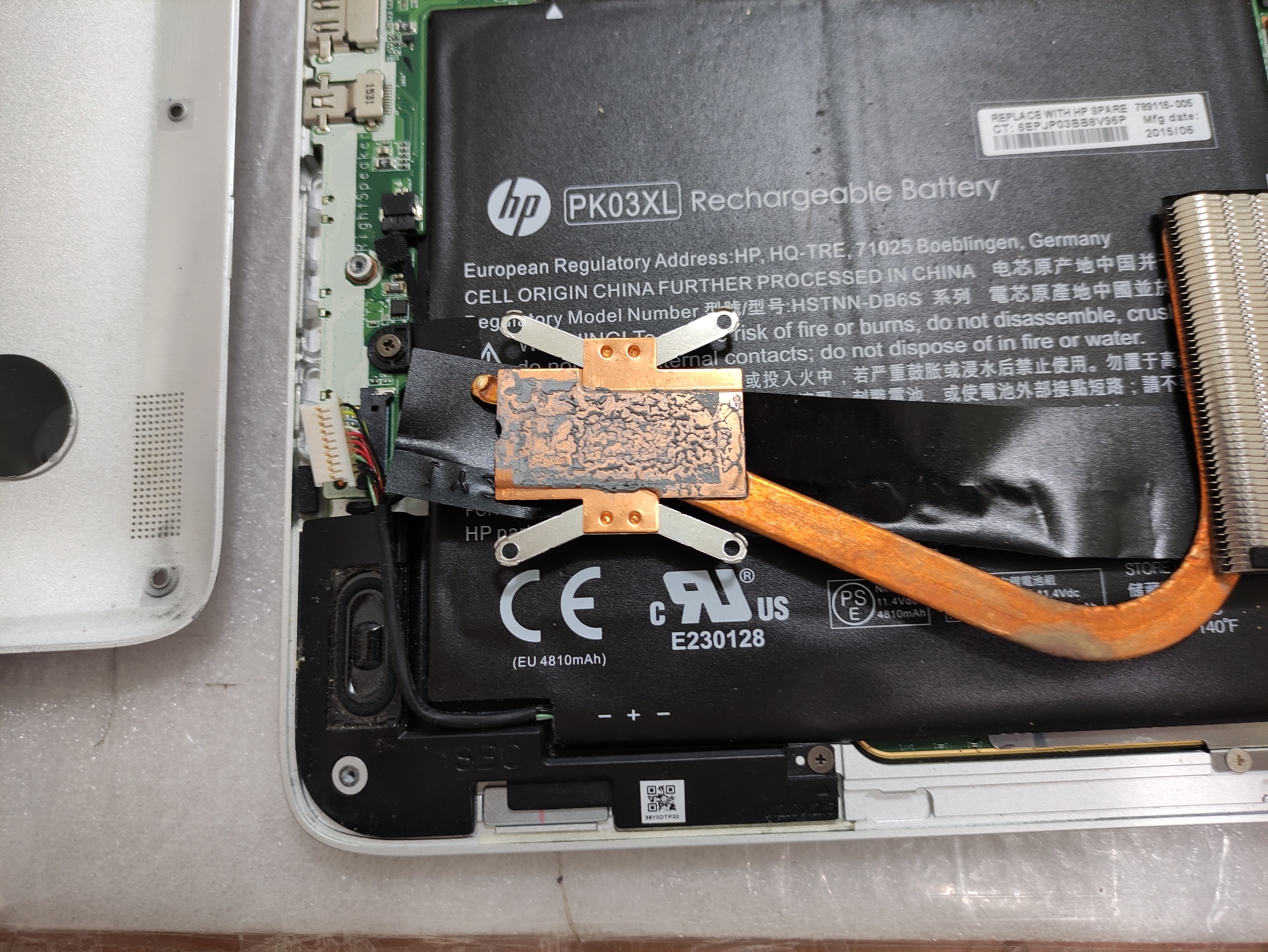 The battery contains a model called PK03XL. The battery area is big enough to exceed half of the laptop. Li-ion Battery