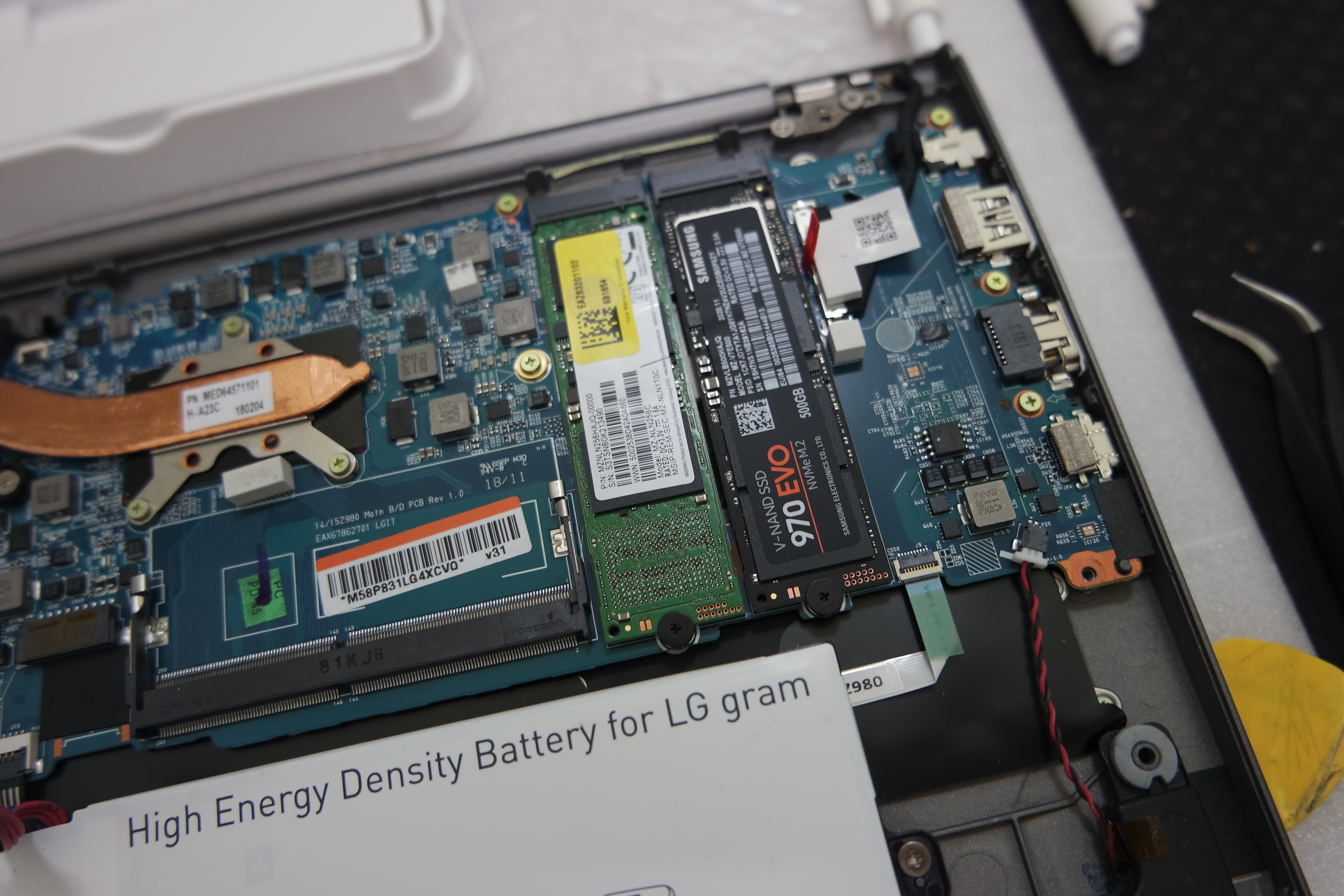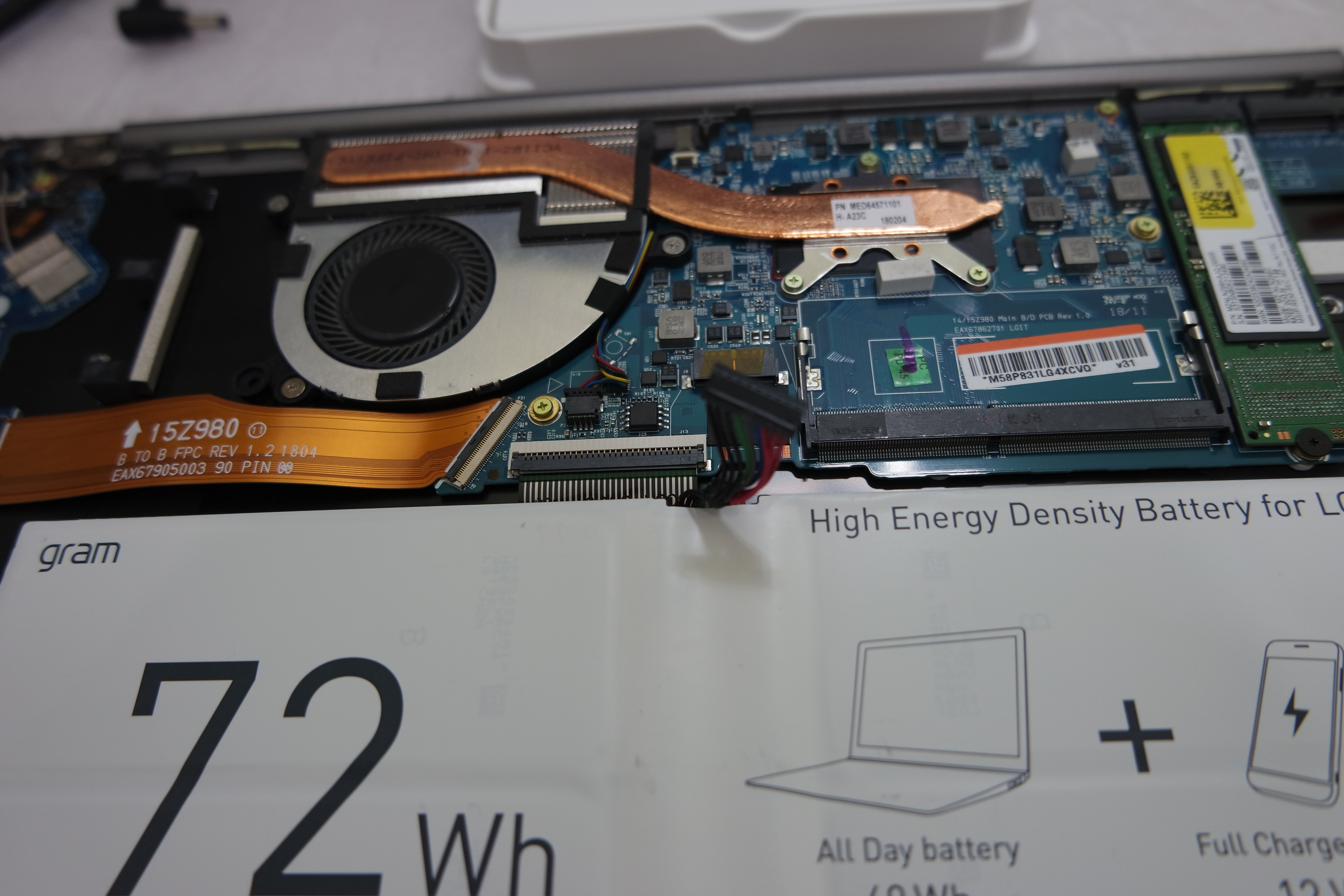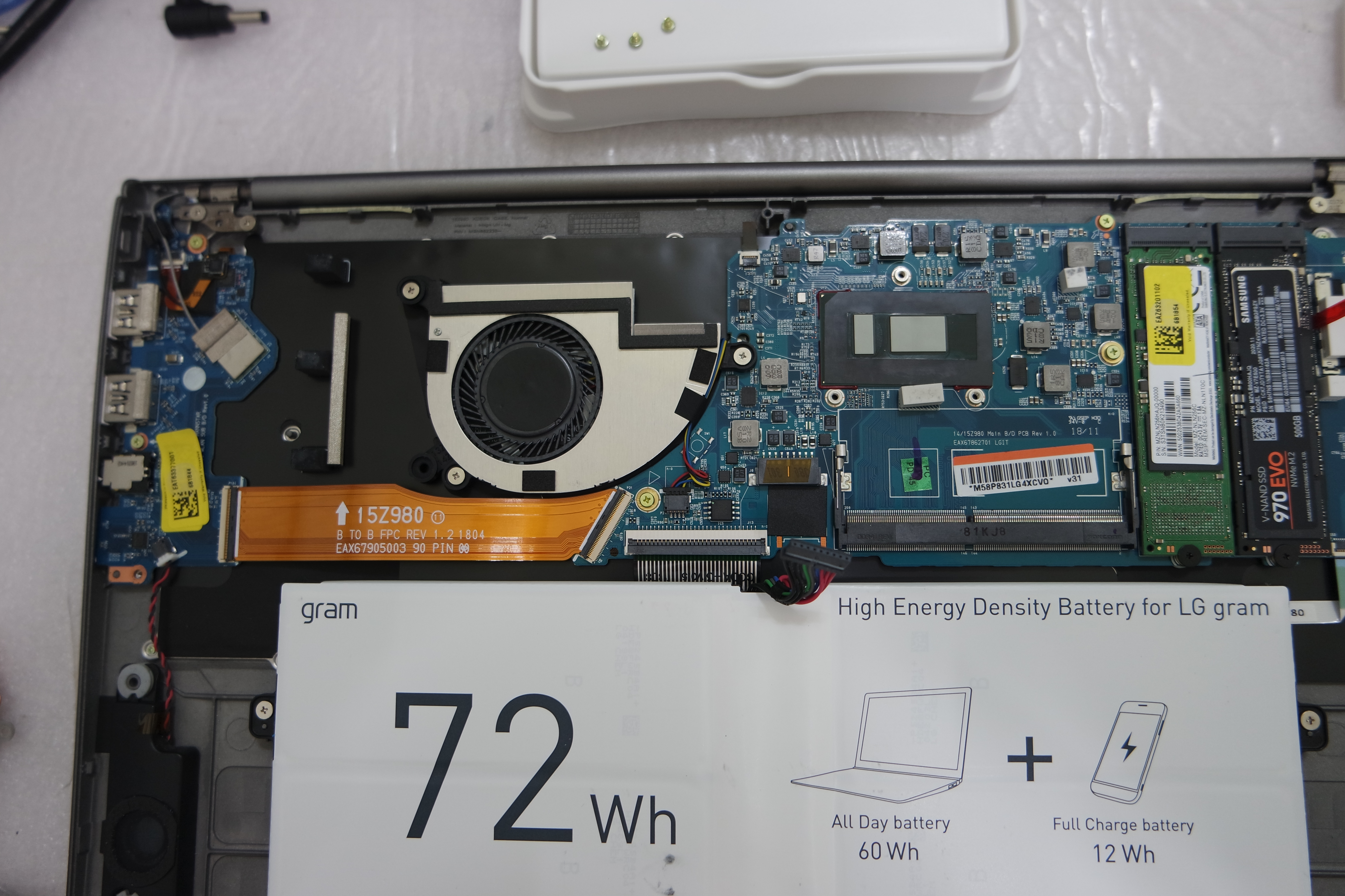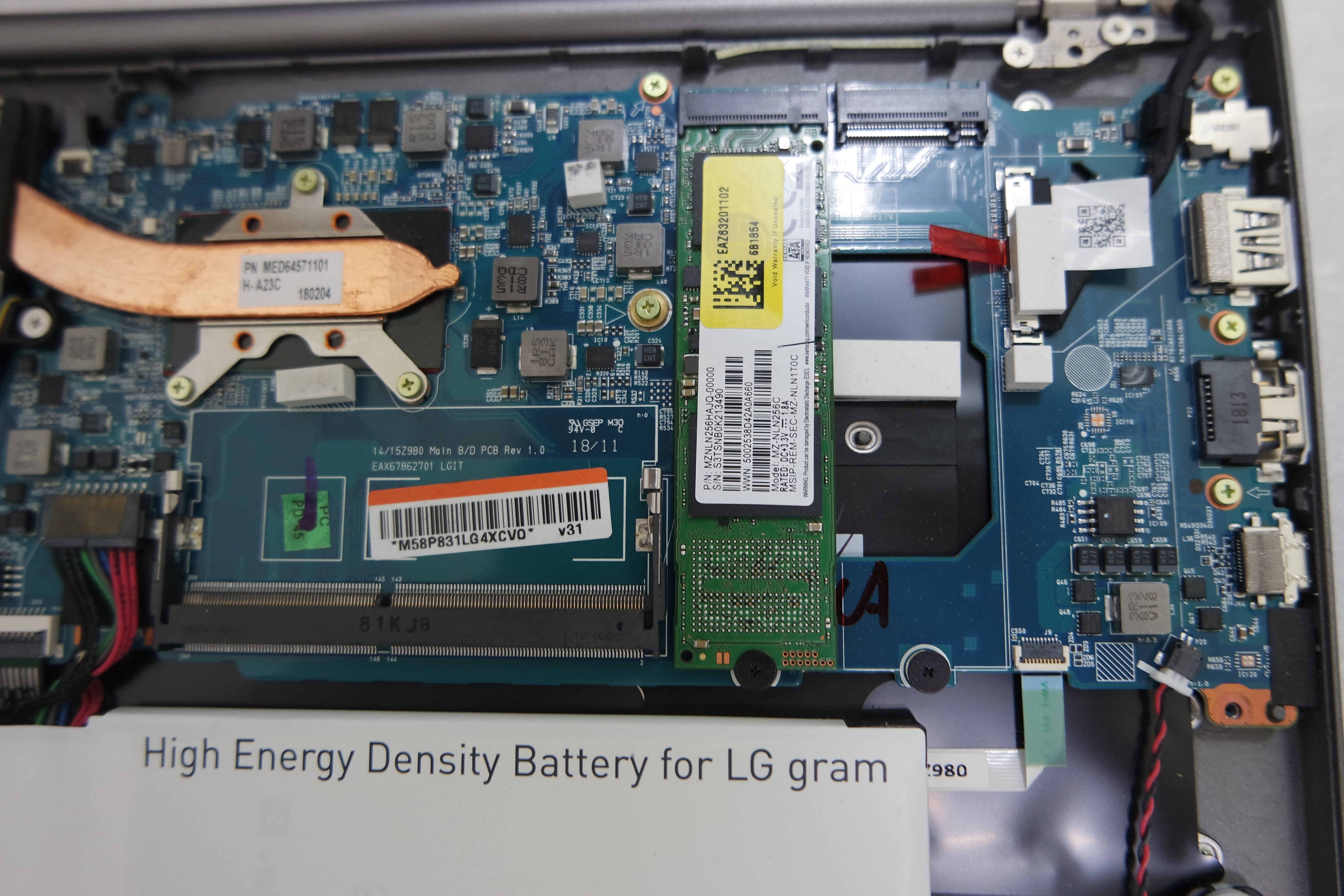 그램 노트북의 분해된 모습입니다. 배터리가 노트북의 절반 이상을 차지할 정도로 큼지막합니다. 의외로 기판은 손바닥만한 크기입니다. 추가 램슬롯과 M.2 SSD 슬롯 2개가 눈에 띄네요.