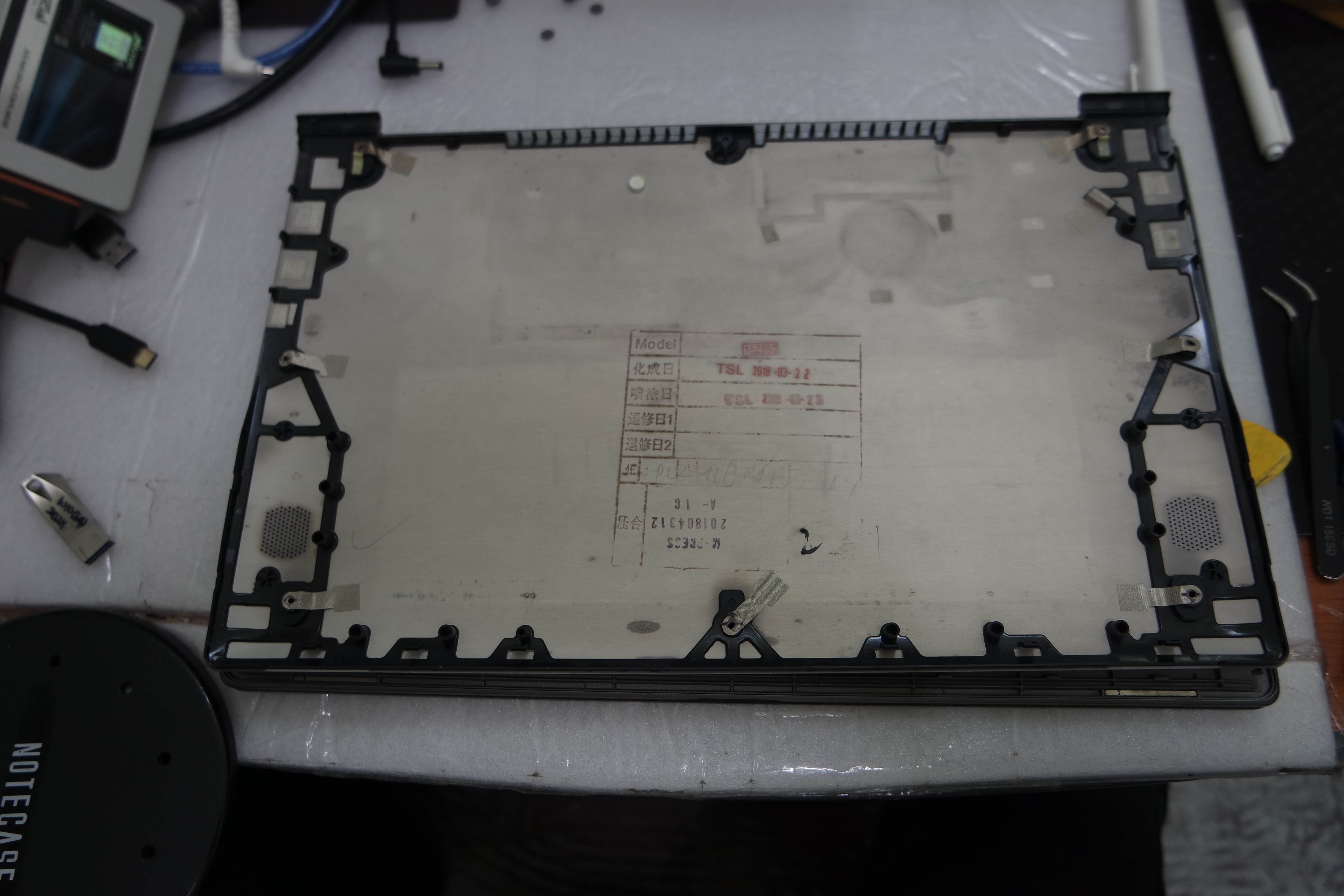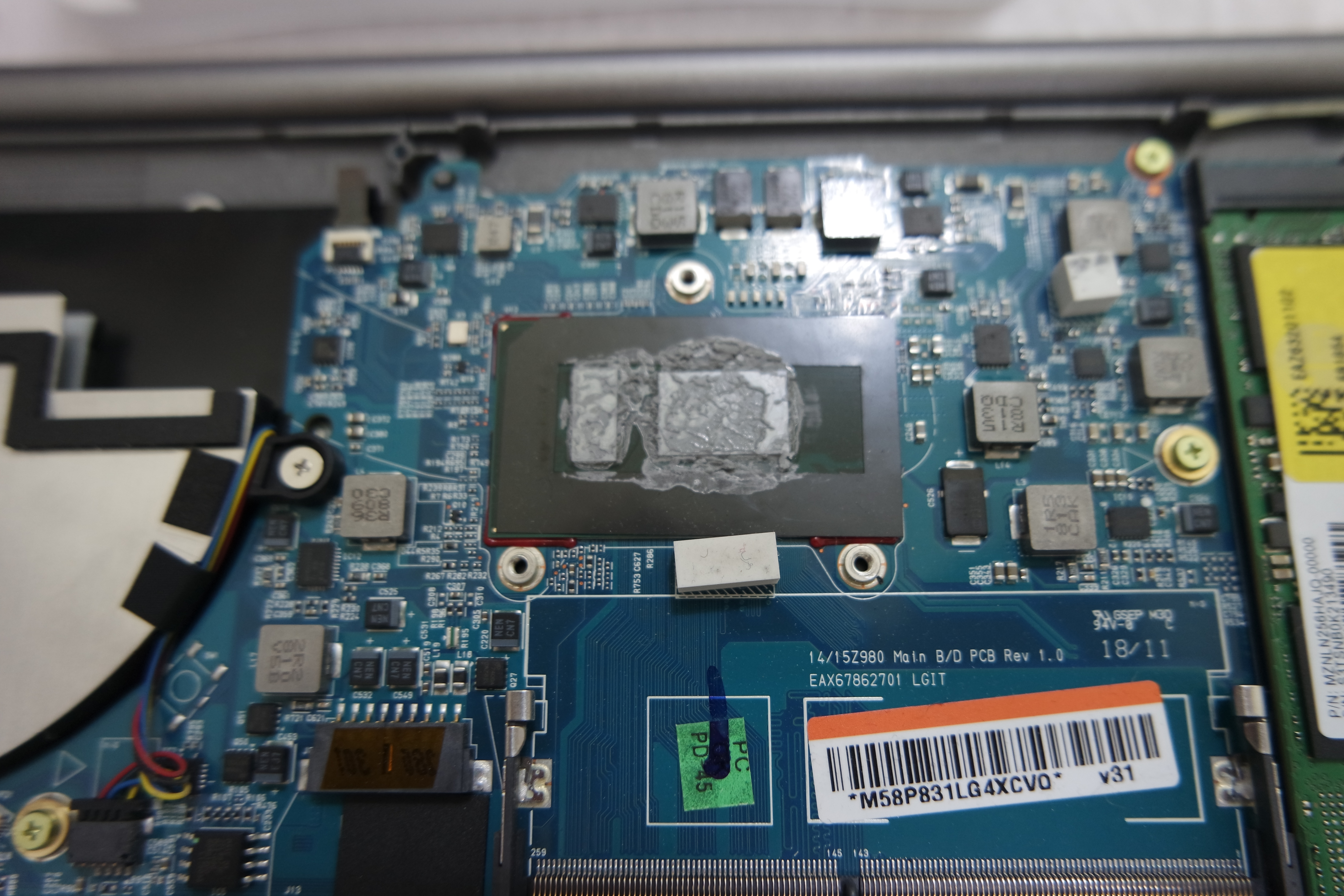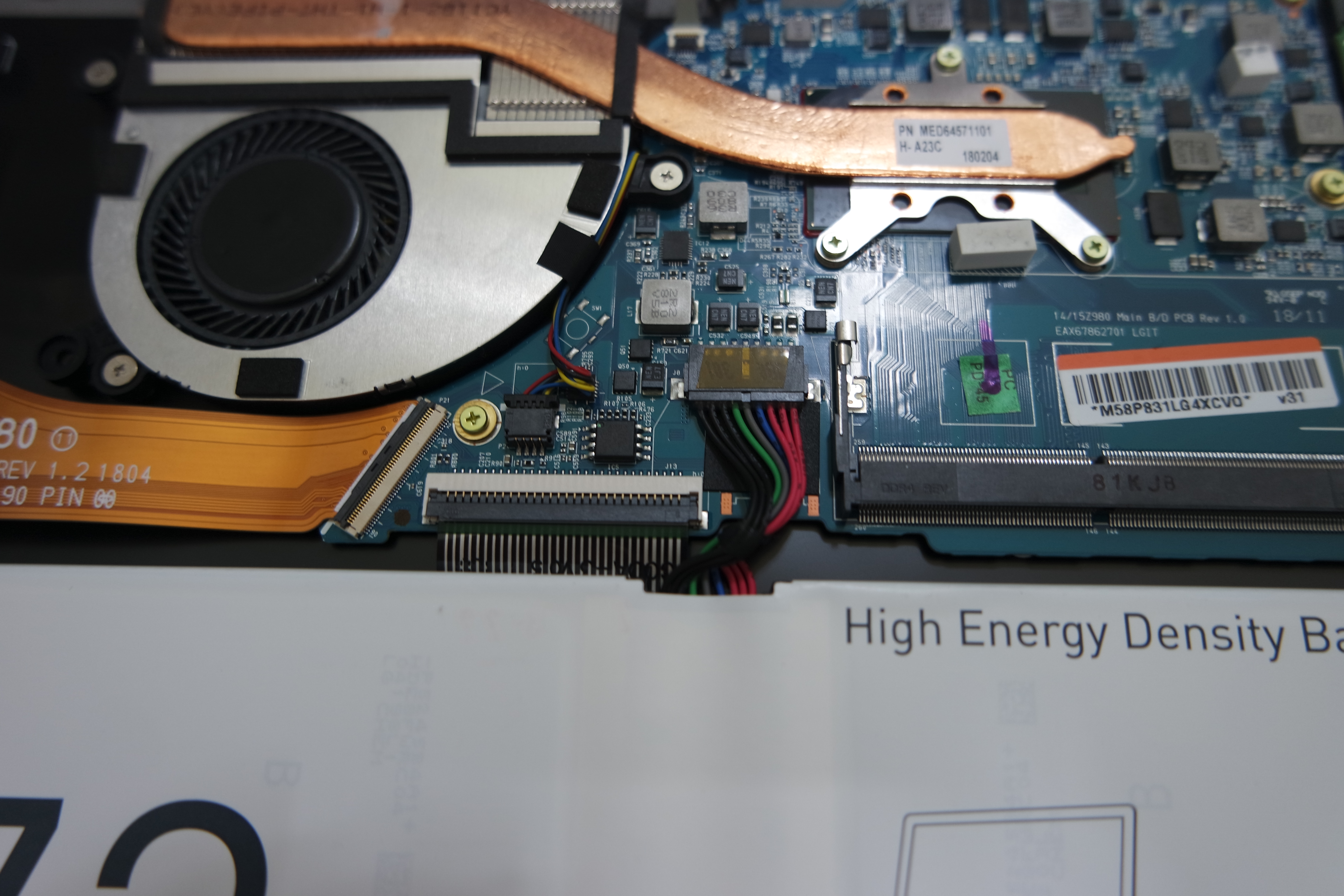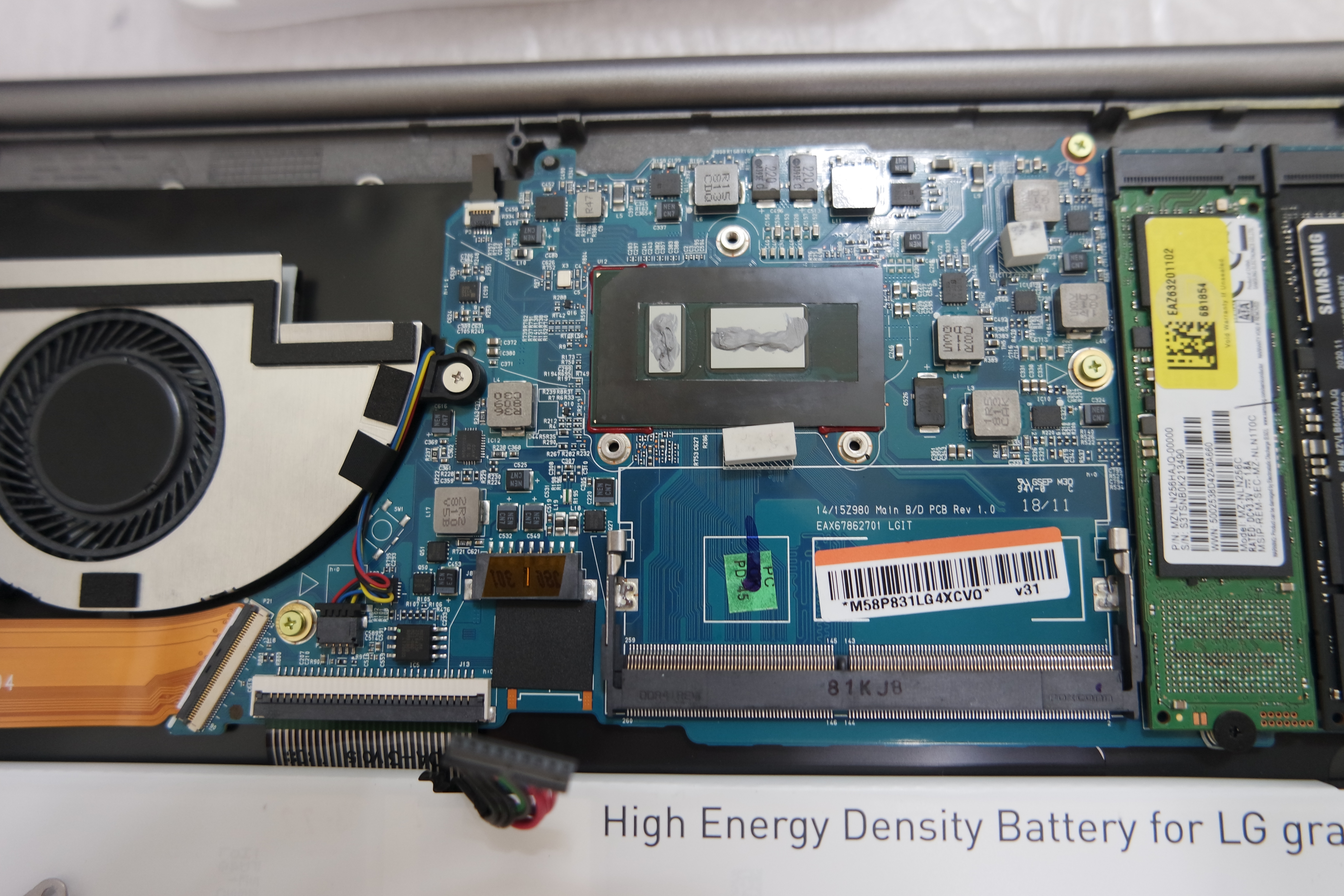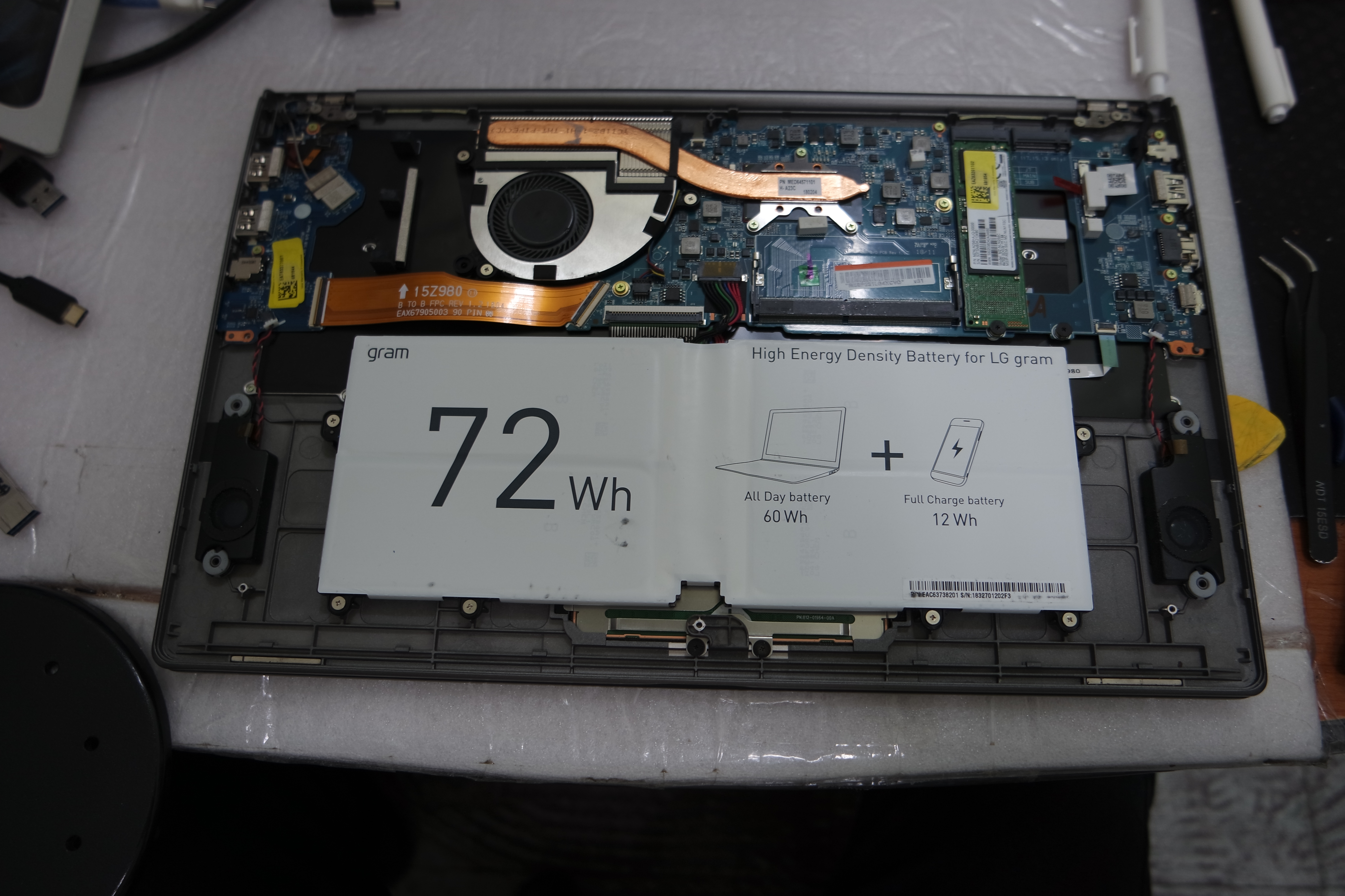 그램 노트북의 분해된 모습입니다. 배터리가 노트북의 절반 이상을 차지할 정도로 큼지막합니다. 의외로 기판은 손바닥만한 크기입니다. 추가 램슬롯과 M.2 SSD 슬롯 2개가 눈에 띄네요.