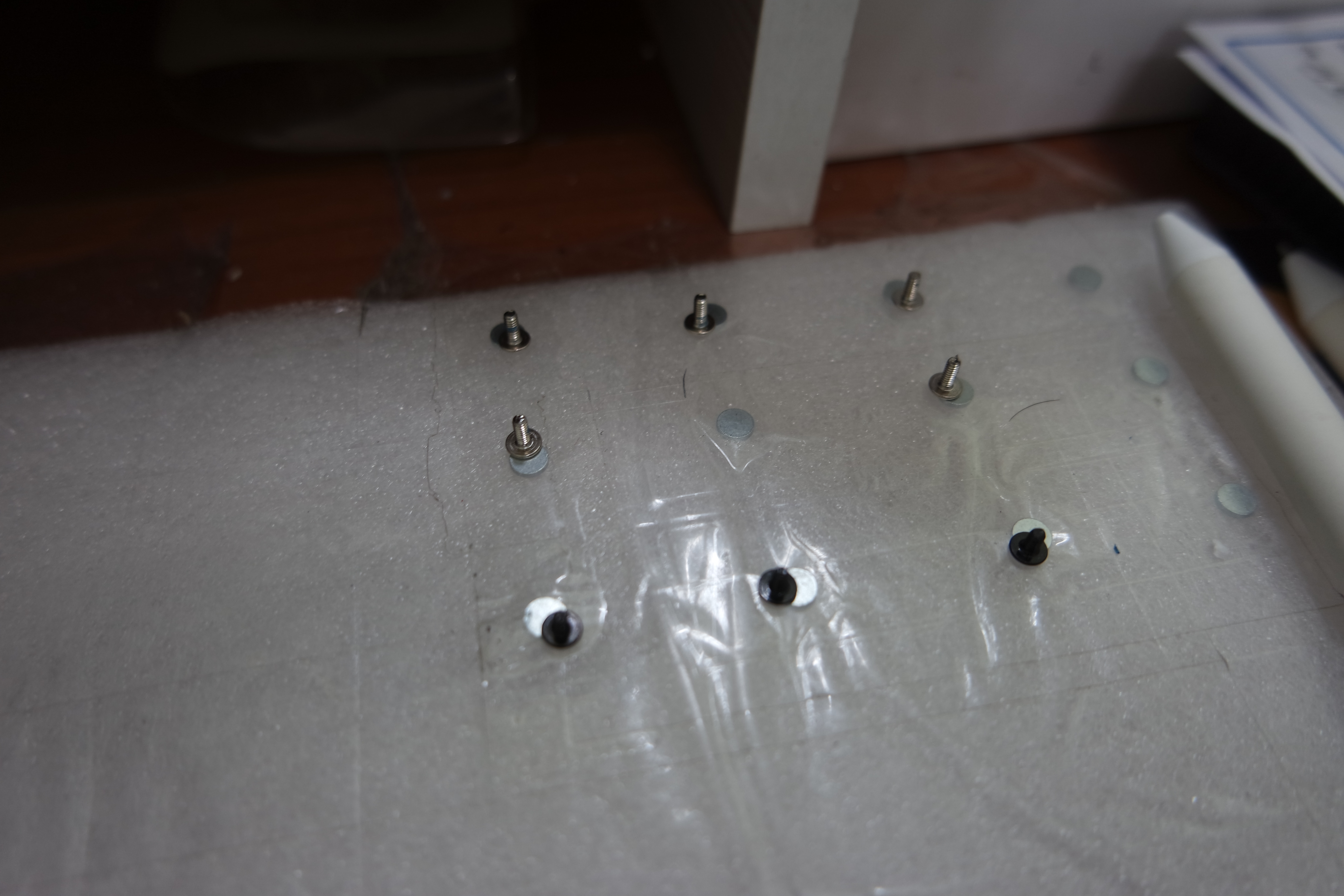 뒷면에 고정된 모든 나사를 제거하고 있습니다. 총8개의 나사로 조여진 상태입니다. 미끄럼 방지 패드를 제거하면, 나사가 위치별로 있습니다.